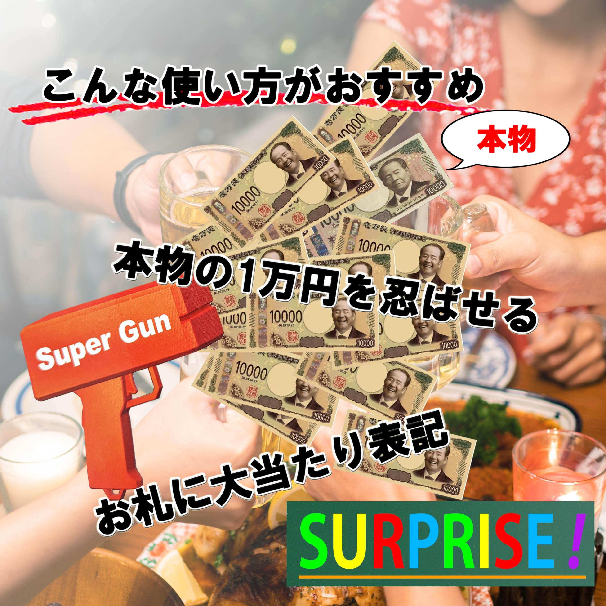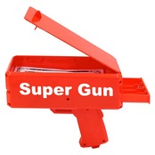 最新版のお札を大量電動噴射できるマネーガン。本物の1万円札を1枚入れたり、お札に景品を書いてばらまいたり!使い方いろいろ。