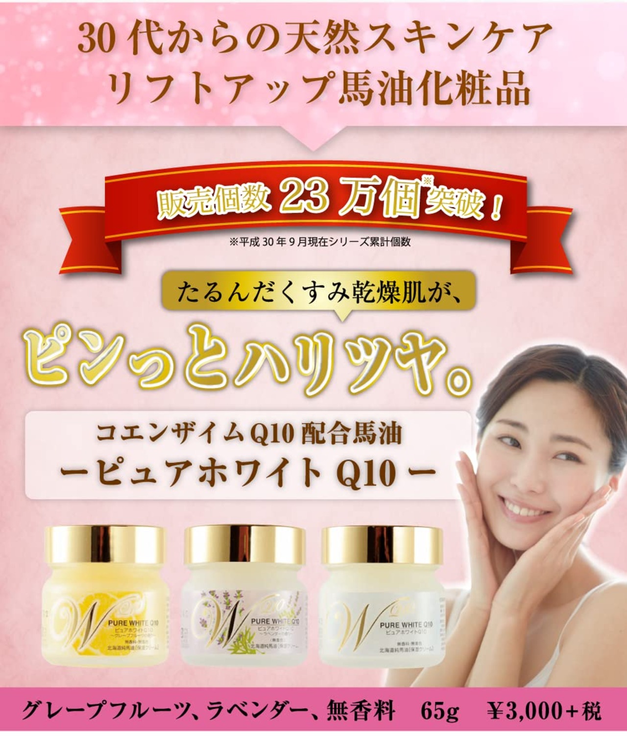 北海道純馬油本舗人気NO.1の、ピュアホワイトQ10のスタンダードシリーズ。 天然馬油にコエンザイムQ10を配合したスキンケアオイルです。 馬油が肌をうるおし、コエンザイムQ10がピンっとハリのある肌へ導きます。 香りは、無香料・グレープフルーツ・ラベンダーよりお選びいただけます。馬油本来の匂いがないので、匂いの気になる方にもおすすめです。