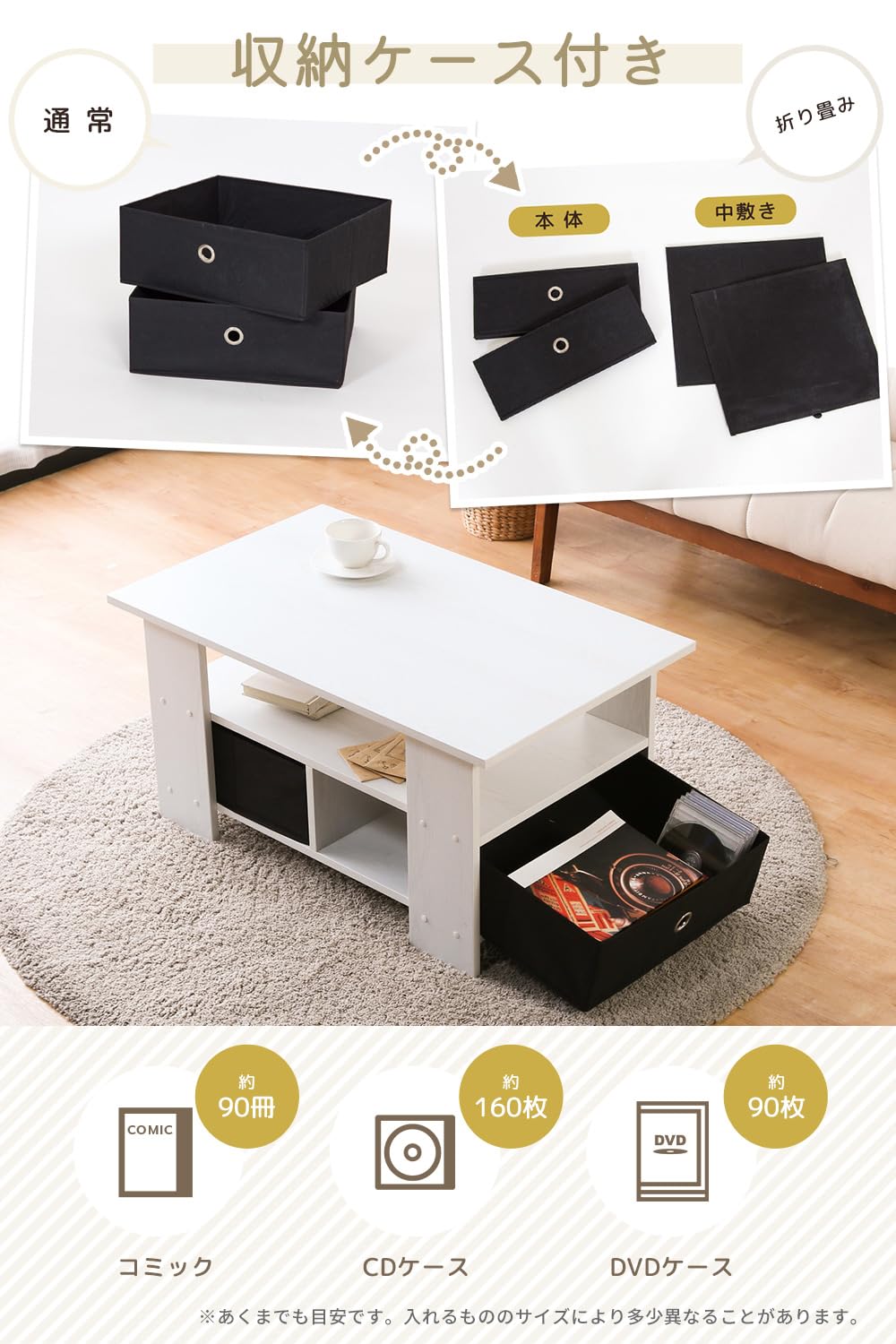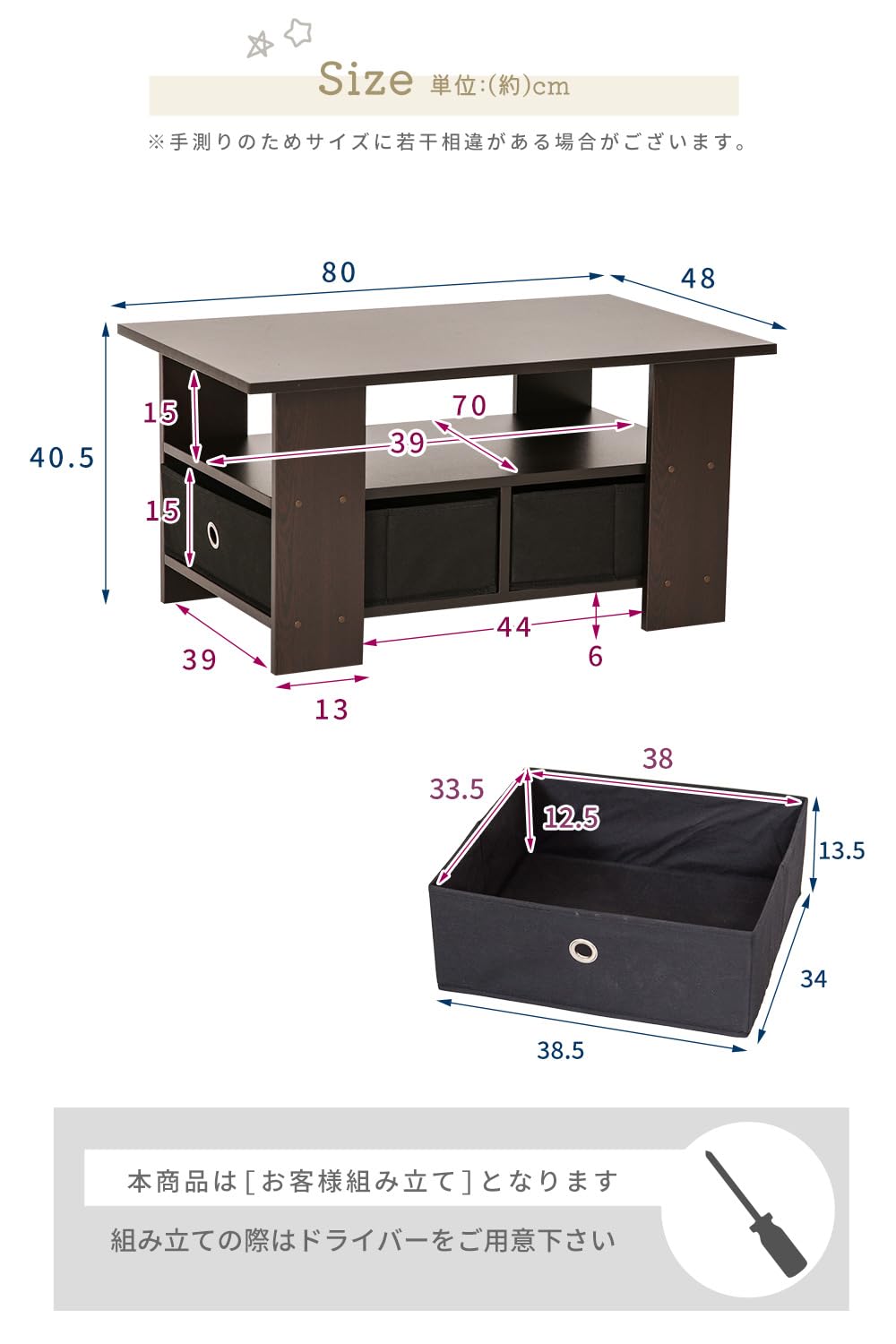 【商品番号】uni2062 【サイズ】(約)幅80cm 奥行き48cm 高さ40.5cm 【梱包サイズ】52cm×88cm×7cm 【材質】本体:パーチクルボード 引き出し:不織布 【重量】約12kg 【生産地】中国 【備考】耐荷重:約30kg【コンパクトな省スペース設計で使い方は自由自在!】コンパクトで使いやすいサイズ感。収納スペースも多いので、リビングテーブルとしてはもちろん、勉強机や作業机、化粧台、さらには前後左右にオープンスペースがあり、配線も自由に通せるので、テレビ台としても活躍します。これ1台でいろいろな使い方が出来ます。【シンプルで使い勝手の良い、棚収納】前後左右、物の出し入れが楽に出来きるワイドな中棚。よく使う物は、サッと取り出せて便利です。下棚は真ん中で区切られているので、左右それぞれで使い分けて収納ができます。【取り外し可能な収納ケース付き】棚に収まる収納ケース2個付き。テーブル周りのごちゃつく小物などを、生活感を隠しながらまとめて収納して頂けます。収納ケースは中棚にも下棚にも入れる事が出来、取り外しも出来るので、自分なりにアレンジし放題。収納ケースは使わない時にはコンパクトに折り畳めるので邪魔にもなりません。【最適なフロアライフをご提供】床から天板までの高さが約40cmと、ソファとの相性も抜群。座椅子やクッションなど、ロースタイルでの生活にも適した高さです。コンパクトなサイズの為、圧迫感が少なく、お部屋が広く感じられます。リビングから1人暮らしのワンルームまで幅広く活躍してくれる事、間違いなし。シンプルなデザインで、組み立ても簡単。脚部には床に傷をつけにくくするプラスチックのキズ防止パーツも付いており、安心感もアップ。