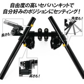 【商品説明】 ■バーハンドルからセパレートハンドルに変更できるセパレートハンドルキットです。 ■バーハンドルの決められたポジションに不満を感じていたライダーや、ハンドル周りを自分好みに改造して見たかったライダーに! ■スタイリッシュなデザインに機能性抜群ですのでとてもオススメな商品です ■こちらのセパレートハンドルは画像(Aタイプ・Bタイプ)のように、バーの長さや高さ、角度調整機能だけでなくお取り付けできるスペースさえあればハンドルステー部分をお好みのポジションにそれぞれ組み換え可能! ■一番リラックスして走行できるハンドルポジションをお探し下さい!!