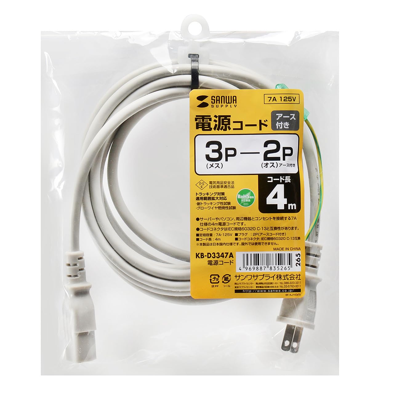 サンワサプライ(Sanwa Supply) 電源コード 4m (ライトグレー) KB-D3347A