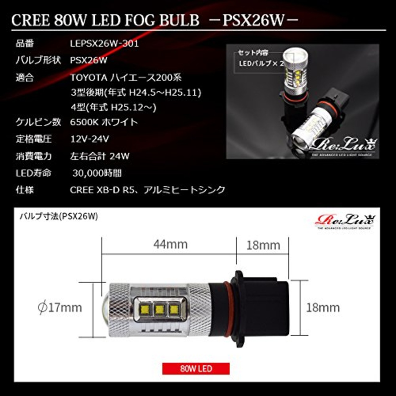 ハイエース 200系 3型後期 4型 PSX26W 80W ホワイト LED フォグバルブ<br> ■品番 LEPSX26W-301<br> ■バルブ形状 PSX26W<br> ■適合 TOYOTA ハイエース200系 <br> 3型後期(年式 H24.5~H25.11)<br> 4型(年式 H25.12~) <br> ■ケルビン数 6500K ホワイト <br> ■定格電圧 12V-24V <br> ■消費電力 左右合計 24W <br> ■LED寿命 30,000時間 <br> ■仕様 CREE XB-D R5chip、アルミヒートシンク