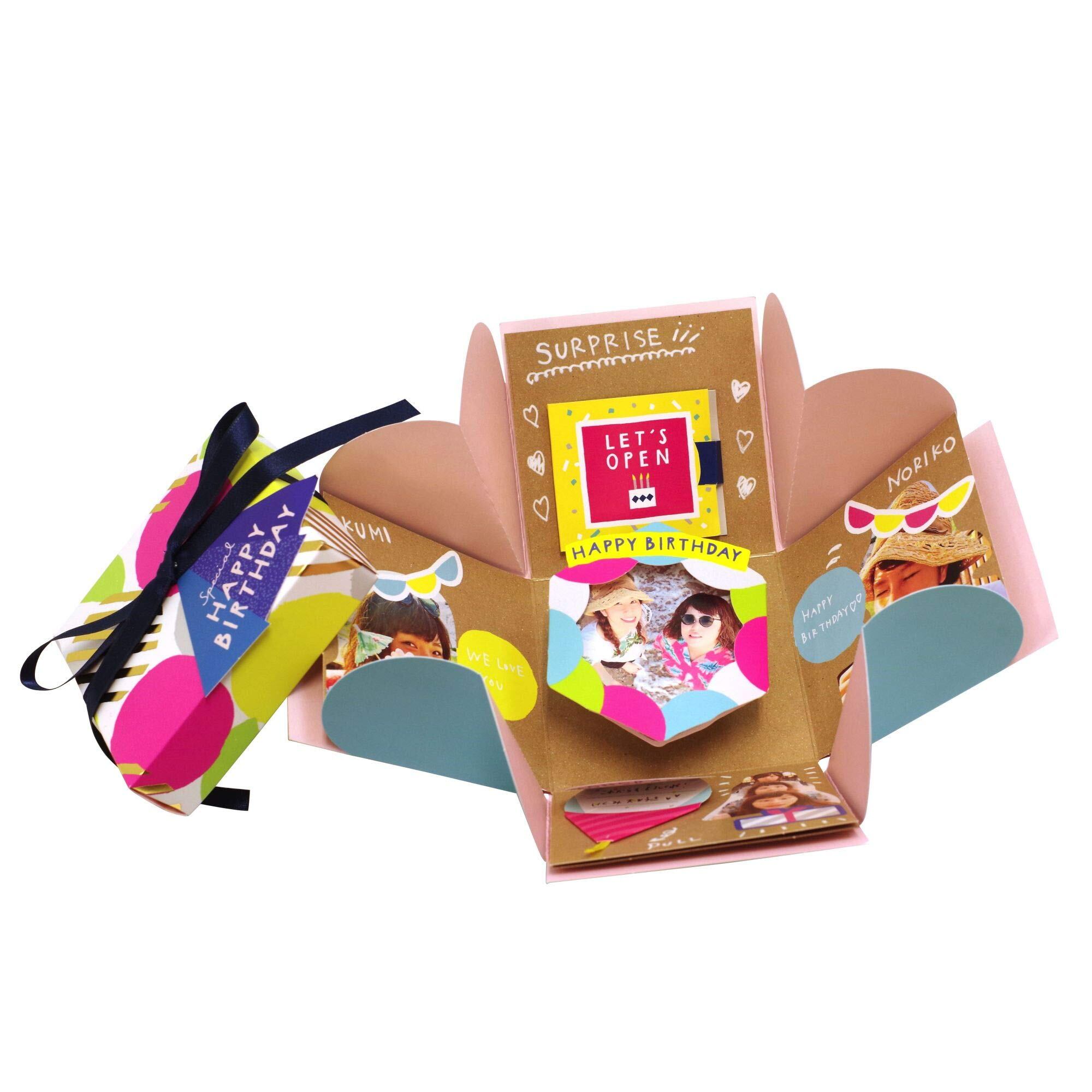セット内容 :アルバムプレゼントボックス×1(フタ×1、台紙付き本体×1)、デコレーションフレークシール×28枚、ポップアップフォトフレーム×1(フォトフレーム×1、バネ×1、接着用両面テープ×2)