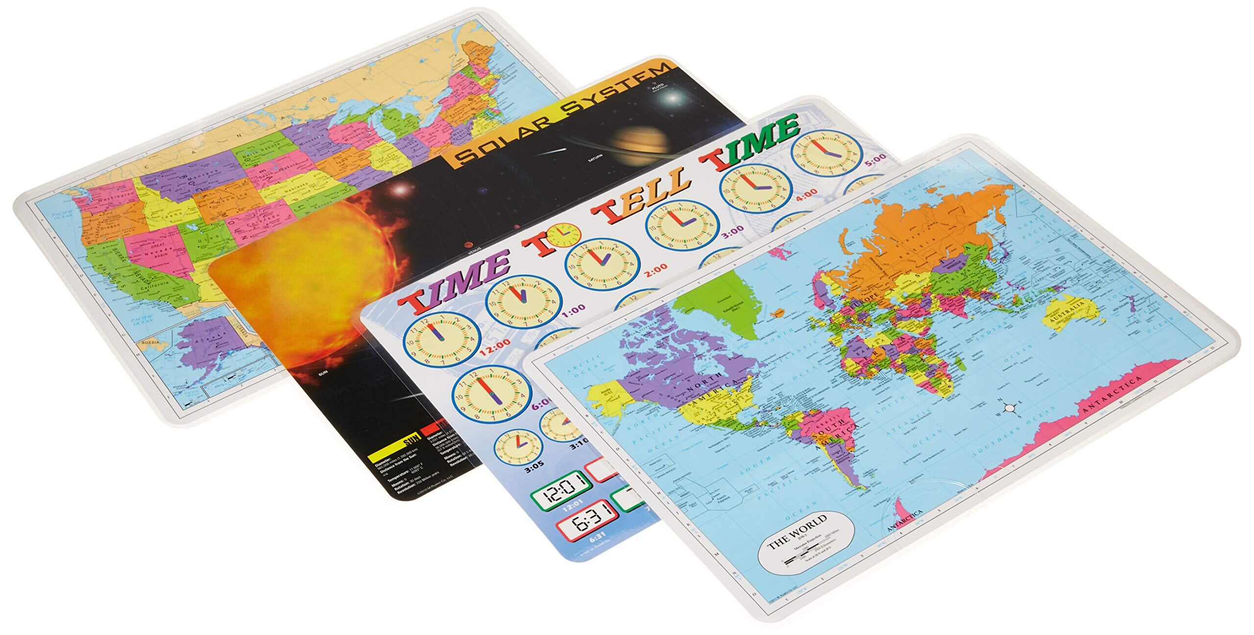 Painless Learning 教育プレースマット 子供用 米国と世界地図 時間とお金、アルファベット、米国大統領、太陽系、掛け算、8枚パック