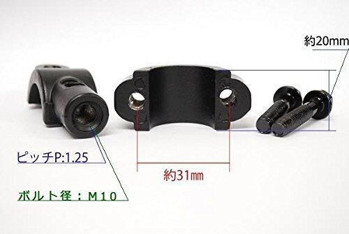 No-1058x2<br> ■商品の状態:新品<BR> ■サイズ:M10 ピッチ1.25(画像をご確認ください。)<BR> ■取り付け部の幅:約2cm<BR> ■カラー:黒<BR> ■適合ハンドル径:22.2mm<BR> ■適合車種: 汎用品<BR> <BR> ※本商品は、汎用につき「適合サポート・適合保証」がございません。<BR> ※使用方法や取付方法のサポートは行っておりません。お客さまにてお調べをお願いいたします。<BR> ※必ず実車の装着部の各寸法、形状などをご確認の上ご購入をお願いいたします。<BR> ※商品取付時・取付後、ご使用の際の直接・間接の損害については、弊社ではその責任を一切負いかねます。ご了承の上、お客様のご責任の元、ご使用ください。<BR> ※ディスプレイ画面等の環境上、写真と実際の商品の色とは多少異なる場合がございます。<BR> ※生産ロットによりロゴデザインなど仕様変更になる場合がございます。<BR> ※輸入品のため、輸送や保管の際に発生した多少の傷や汚れがある場合がございます。<br> ※簡易包装となります。<BR>