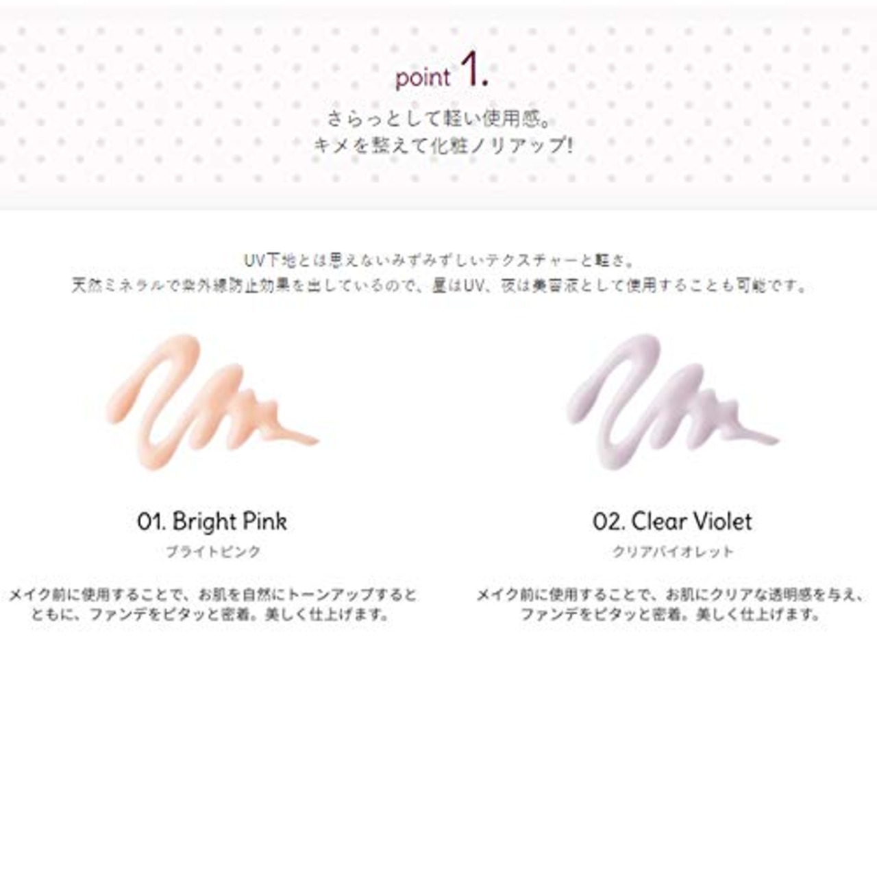 くすみをクリアにして、明るいお肌に仕上げるSPF15PA++のファンデーション下地。昼はUV、夜は美容液としても使える。さらっとして軽い使用感。キメを整えて化粧ノリアップ!生産者の顔が見えるこだわりの原材料で“UVケアしながらスキンケア”。こだわりの配合成分!お肌の保湿、保護に「ウメ果実エキス」・お肌を清潔に保つ、保湿する「ビワ葉エキス、ヨモギエキス、クマザサエキス」お肌のハリ「ビデンスピローサ」お肌の保護、日焼けによるシミそばかすを防ぐ「ツバキオイル」その他、保湿&保護成分として、オーガニック認証済みアルガンオイル&オリーブオイルなどこだわりの原材料を使用しております。クレンジング不要。石鹸でオフ