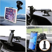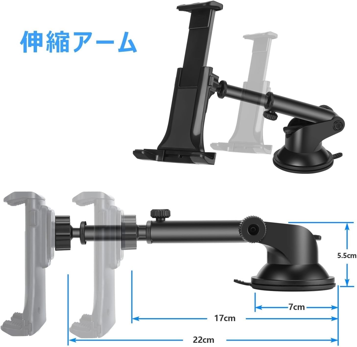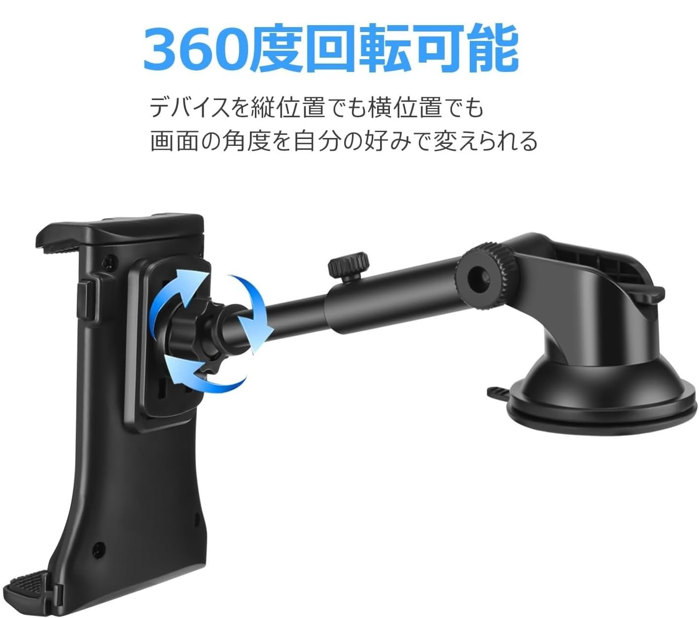 本製品はタブレット&スマホ両用の吸盤式車載ホルダーで、iPadにナビアプリケーションをインストールし、iPadを運転席でナビ代わりにして、もっと大きい画面でナビができます。<br><br><br> サイズ調整可能<br><br> 両側から挟み込むだけのタイプは構造的に落下の危険はありますので、本ブラケットはシンプルな3点固定構造で、安定性があり、デバイスの大きさに合わせてちゃんとロックがかけることができて、スマホもタブレットもしっかり固定できます。<br><br><br> 簡単な取付<br><br> 工具や面倒なネジは一切使用せず、ダッシュボードやフロントガラスに直接取りつけできます。<br><br> レバーを下ろすと吸盤が真空状態になり、抜群の粘着力を持ちます。<br><br> 改良した台座で、通常の製品より優れた安定性を持っています。<br><br><br> 吸着力は水洗いで復活<br><br> ほこりが付いて吸着力が弱くなる時、簡単に水で洗い流したら、また新しくなって使用することができます。<br><br><br> 180度調整可能<br><br> アームは180度調整可能で、画面の角度を自分の好みで変えられて取り付けます。<br><br><br> 伸縮アーム機能<br><br> 伸縮するアーム機能で、最適な視野角を調整できます。<br><br> 下部の支えは移動できるので、各型番のスマホとタブレットの充電ポートを遮らないです。<br><br><br> 充電しながら使用可能<br><br> ボトムフット充電口を塞がれていないので、各型番のスマホに充電ができます。<br><br><br> 4~10.5インチに適用<br><br> 幅広く4~10.5インチのスマホとタブレットに適用します。デバイス+ケースも全然OK。<br><br><br> デバイスをシッカリ守る<br><br> ブラケット先端の柔らかいパッドで固定することにより、デバイスを破損から守ります。<br><br><br> 360度回転可能<br><br> 360度回転するボールジョイントを採用、デバイスを縦位置でも横位置でも設置可能です。<br><br><br> 強力な粘着ゲル吸盤<br><br> 高品質のゲル吸盤で、多少凹凸のあるところにしっかり固定できるようになりました、または車内に跡が残ることはない。運転中、落ちる心配もありません。<br>
