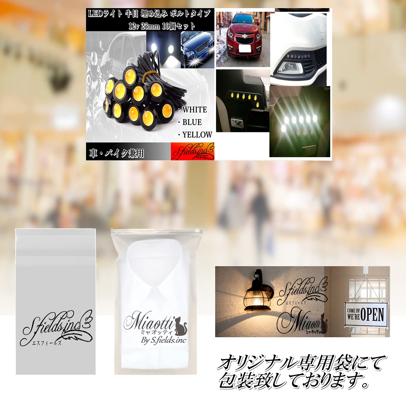 S.fields.inc 牛目 黒枠 白光 丸型 デイライト ボルトタイプ 埋め込み LED 12v 23mm 10個セット (黄)