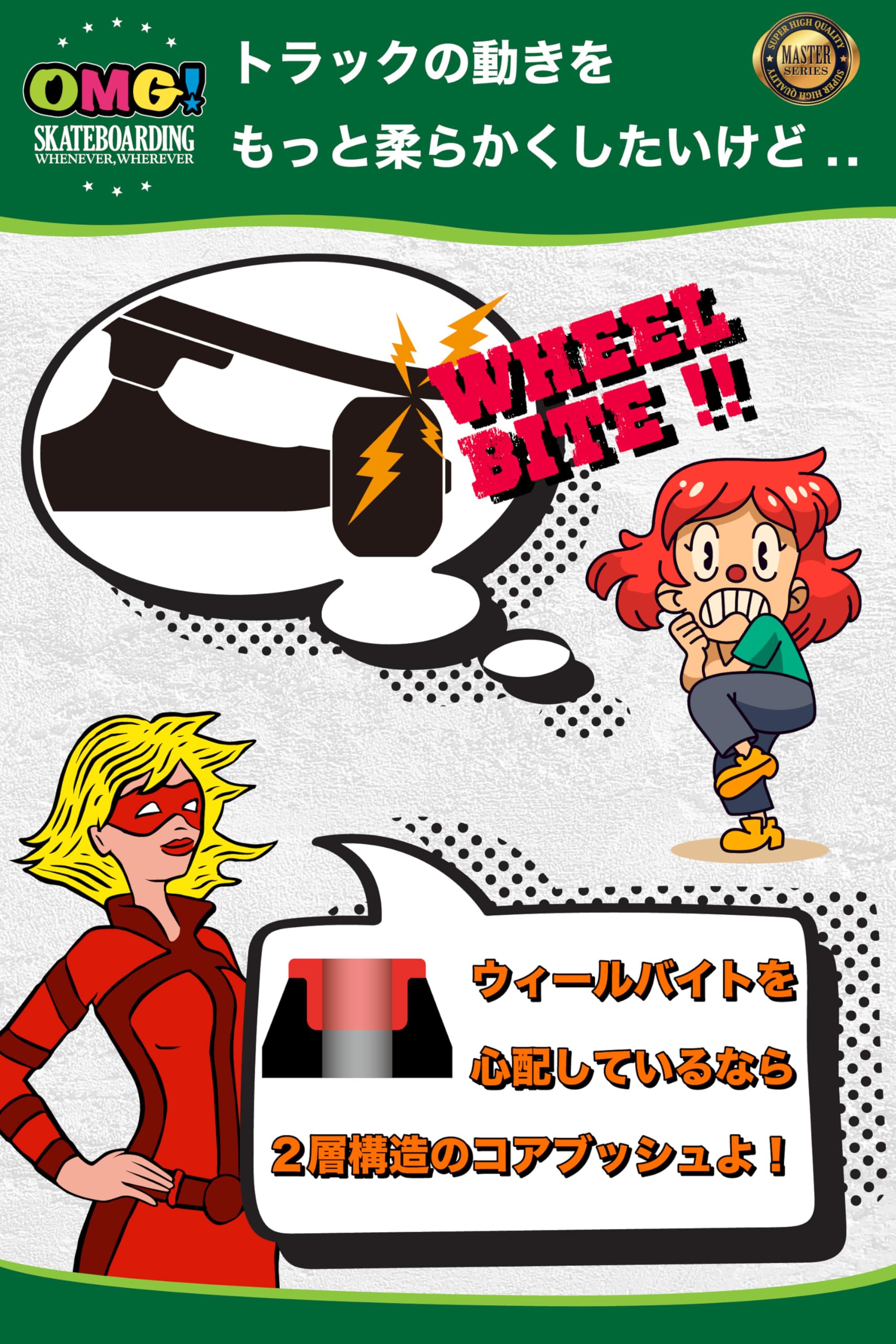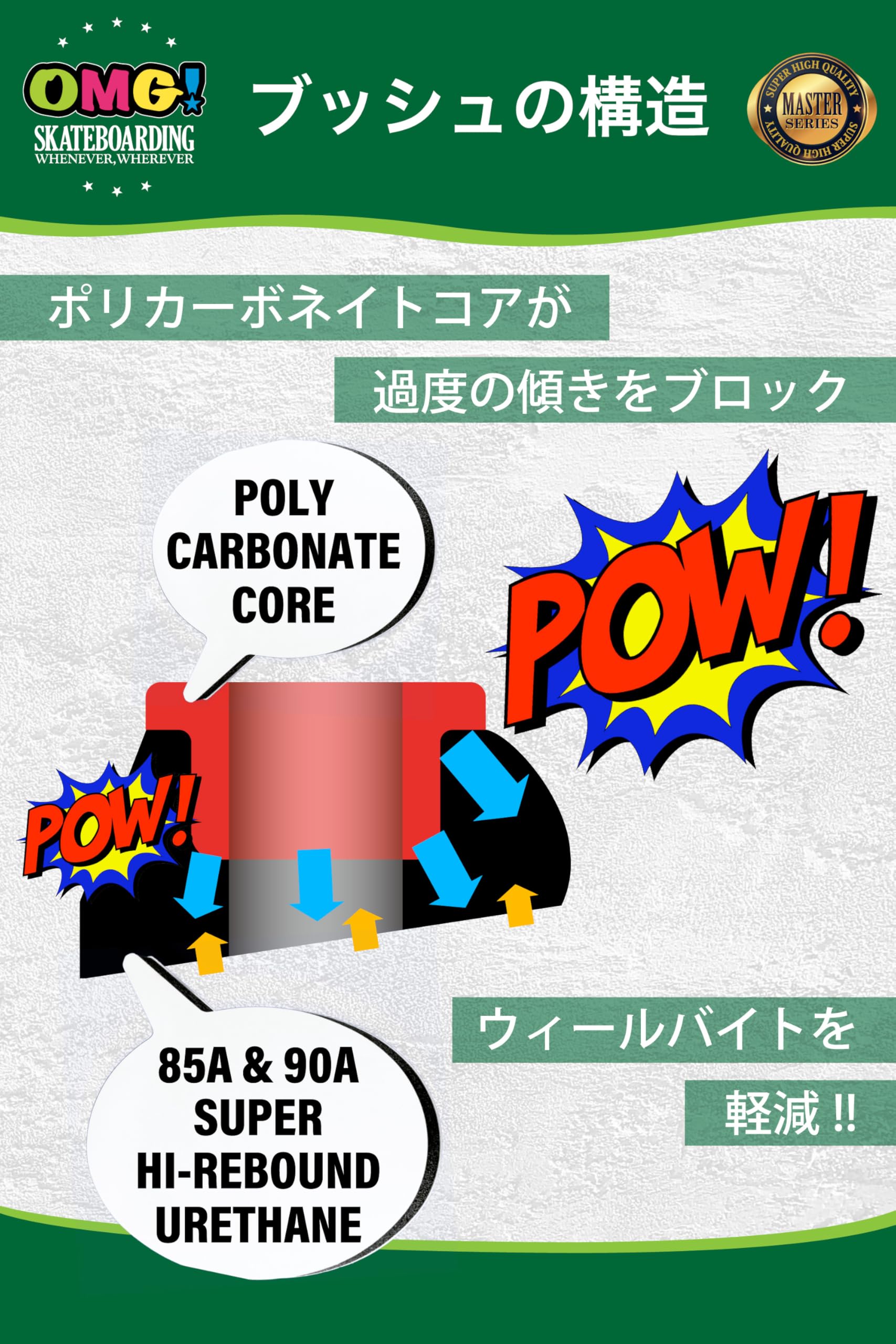 ✅【ウィールバイト予防】ターンや着地の時などにデッキを大きく傾けると、デッキがウィールに当たってしまって、回転しているウィールをロックしてしまいます。このことをスケートボードでは「ウィールバイト」と言い、スケーターの大敵です。コアブッシュを使用する事で、トラックの動きを柔らかくしスケートボードがより自由に動く様にセティングしつつも、ウィールバイトのリスクが軽減されるので、トッププロスケーターやスーパーキッズなどにも愛用者が多くいます。