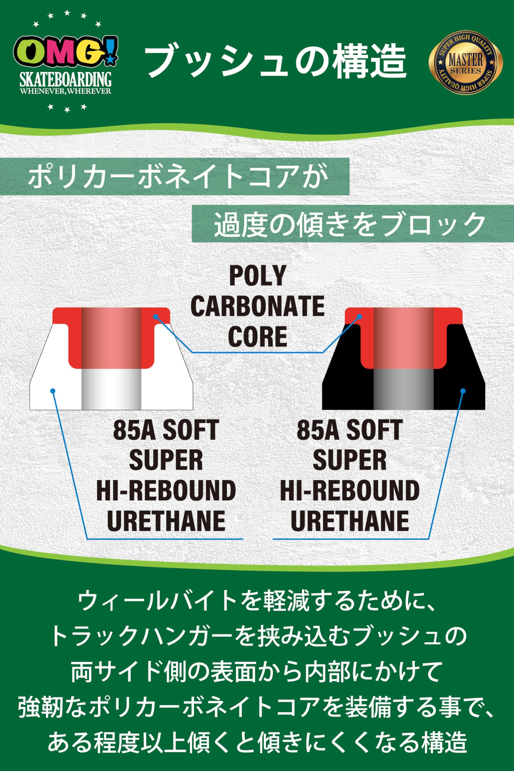 ✅【コアブッシュとは?】スケートボードの舵取りのフィーリングを左右するのがブッシュで、構造や硬さなどで動き具合などが変化し、さらにキングピンナットの締め具合で微調整を行います。コアブッシュは異素材の2層構造になっており、ある程度以上デッキが傾いた時に、通常の単一素材ものよりも、傾き過ぎなくなる効果があります。