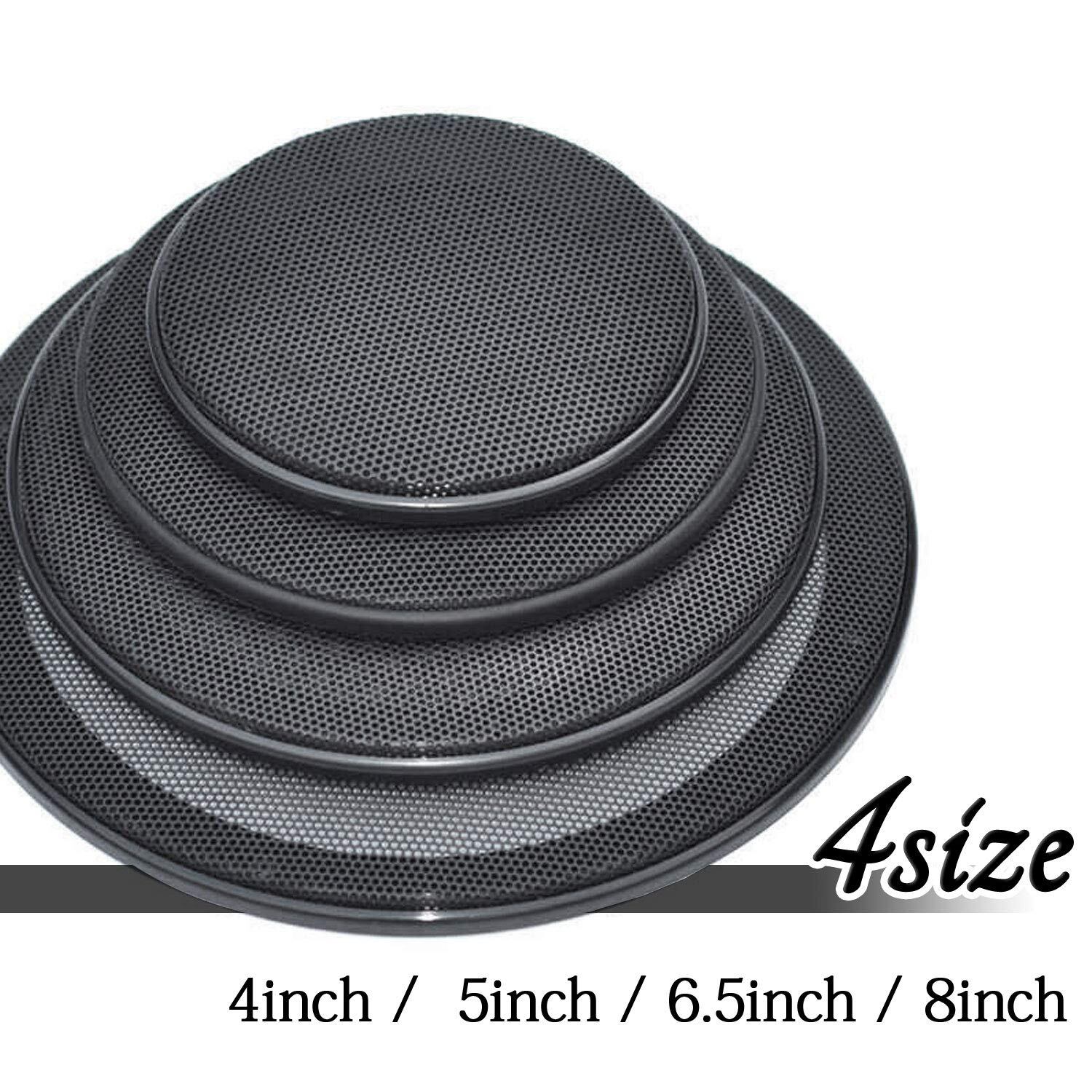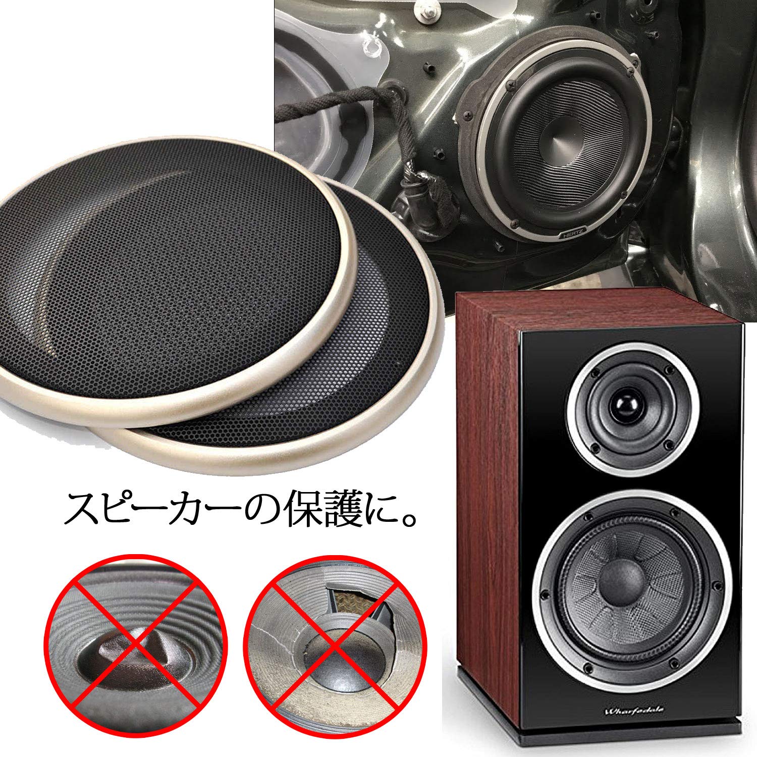 スピーカーのグリルメッシュ・スチールカバーになります。対応するスピーカーのサイズは、4インチ、 5インチ、6.5インチ、8インチの4サイズになります。この商品は汎用性が高く、一般的なスピーカーに適合しやすいサイズです。左右の2枚組で、取り付けネジが付属しています。