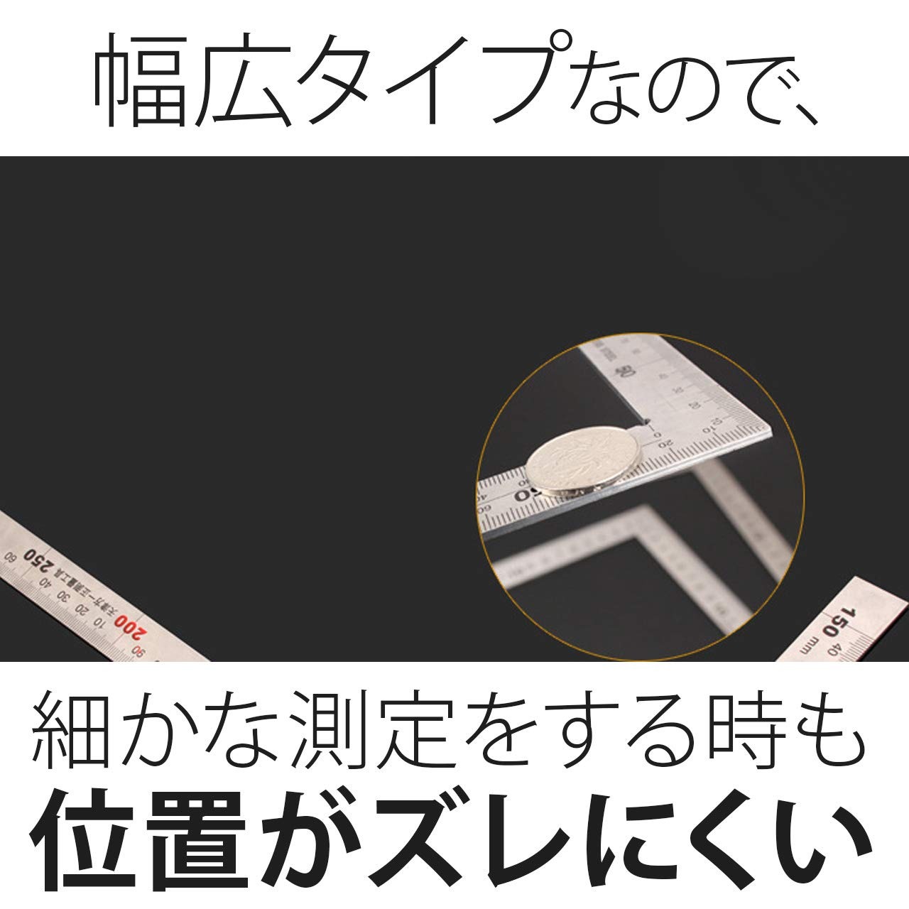 幅広い用途:シルバー加工で表面の反射を抑え目盛が読み取りやすくなっています。長さの測定や直角の確認はもちろん、ケガキ作業などにも適しています。厚みと重みのあるL字形なので、カッターで切る作業の押さえとしても活用出来ます。