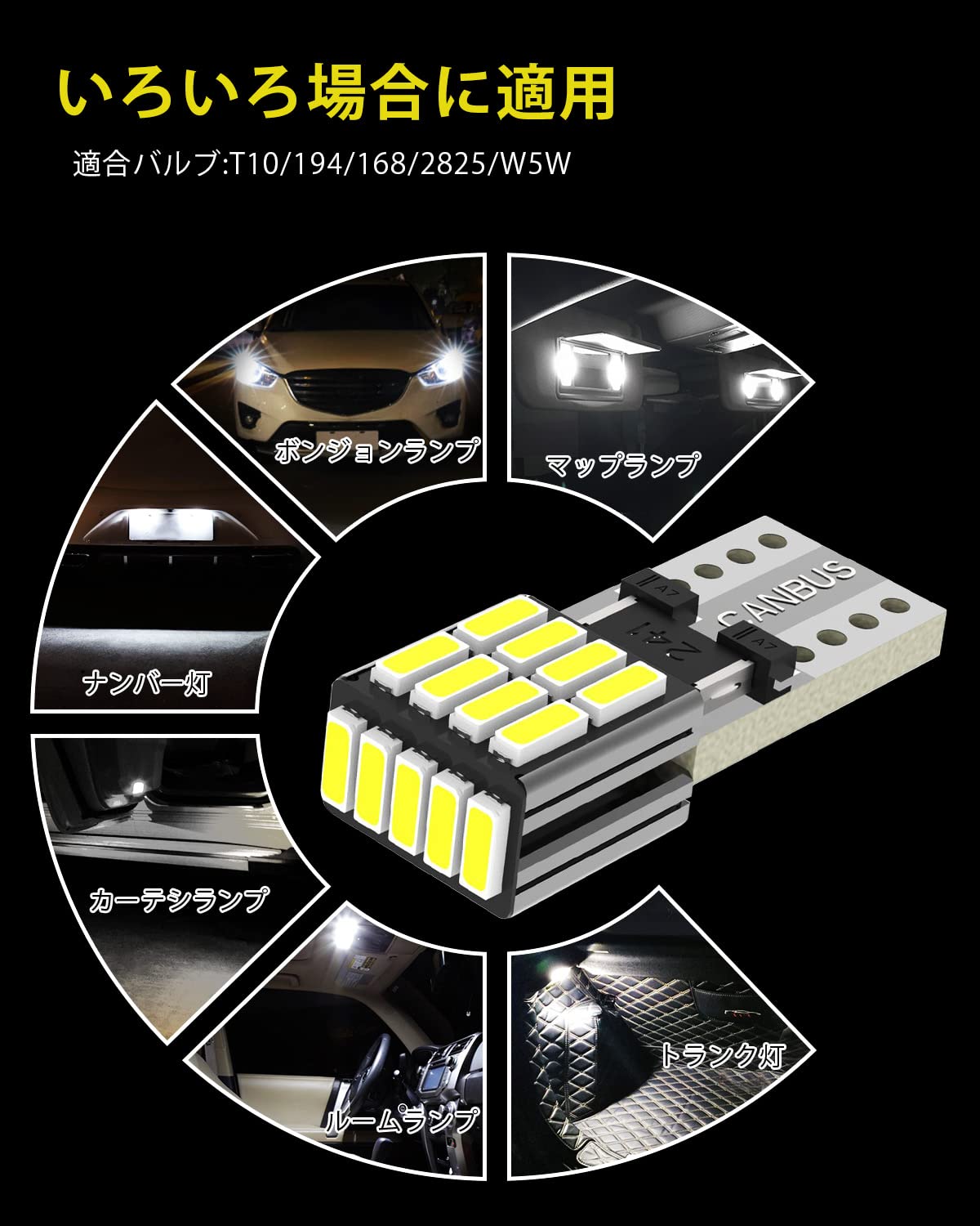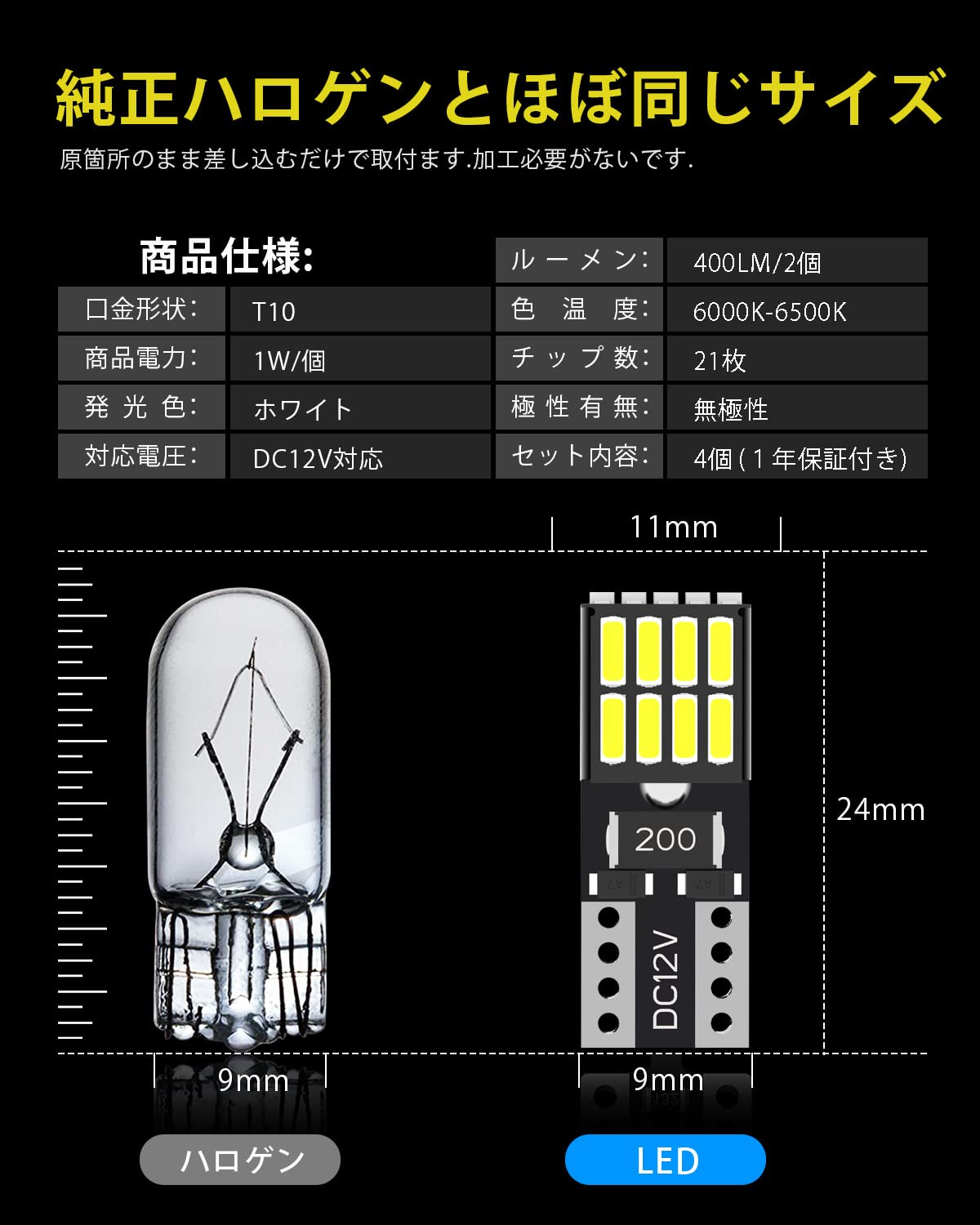 【 12V車用T10バルブ】高発光効率の4014LED素子21個搭載、すみずみまで均一な光を照射。360°全方位照射できます。キャンセラー内蔵で大部分車種はエラーフリー。