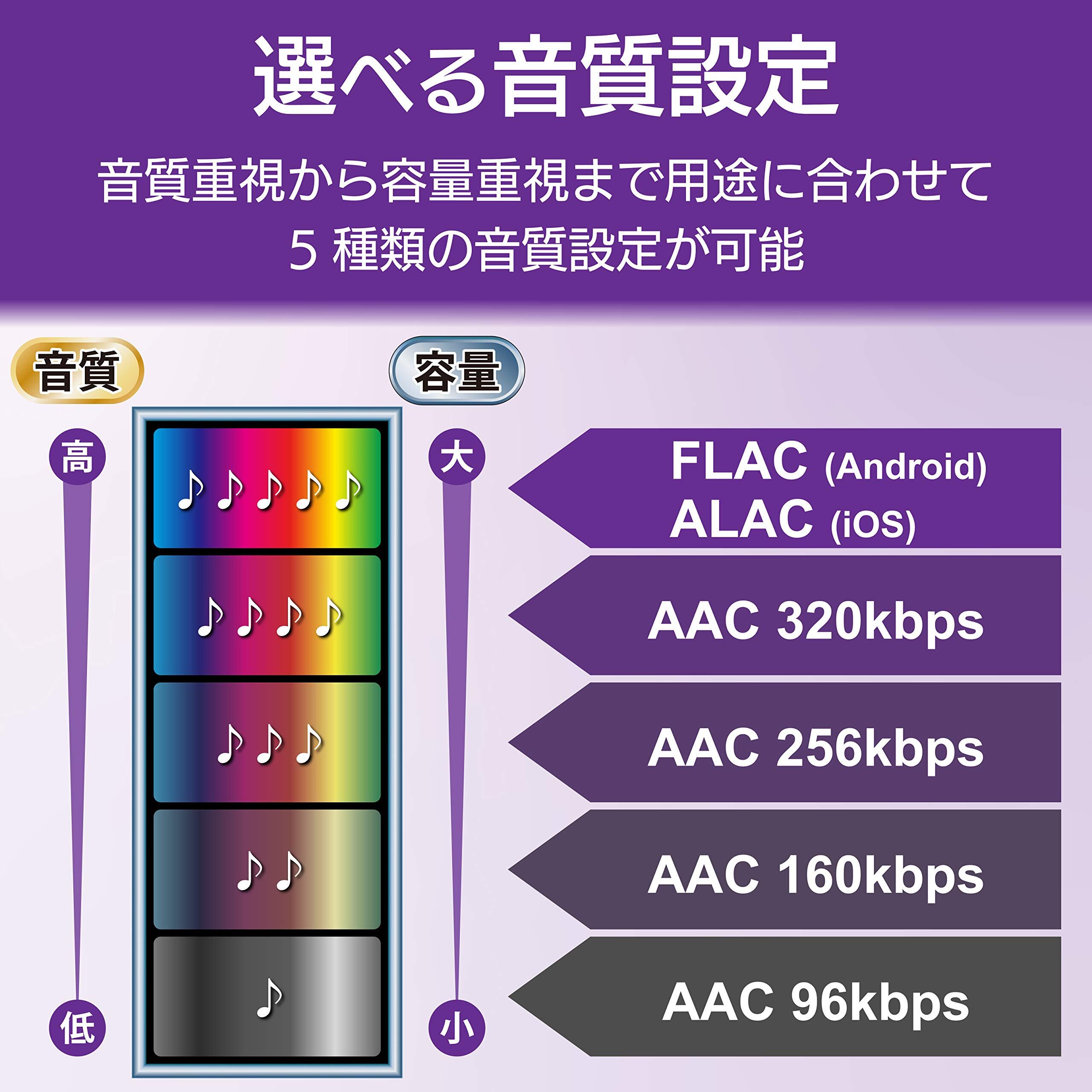 録音音質はロスレスから容量重視まで、音質を追求する人、保存領域を節約したい人、それぞれの好みに合わせられる5種類の音質設定を取り込み時に選択可能です。