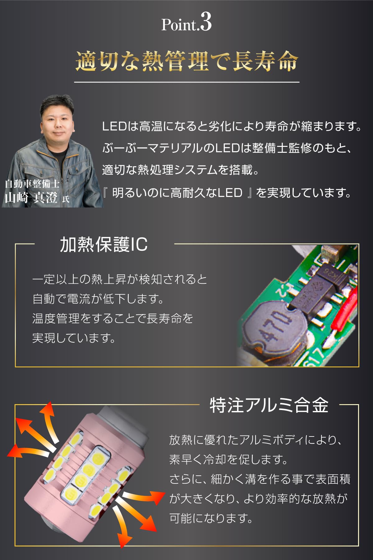 【明るくても超寿命】ぶーぶーマテリアルのLED製品はLEDドライバを搭載しています。ここでは電流値等をコントロールしており、長寿命を実現しています。またLEDのボディは放熱性抜群のアルミニウム素材を採用しており、さらにヒートシンク形状にすることにより効率的な熱処理を実現しました。おかげさまで多くのお客様よりご好評をいただいております。