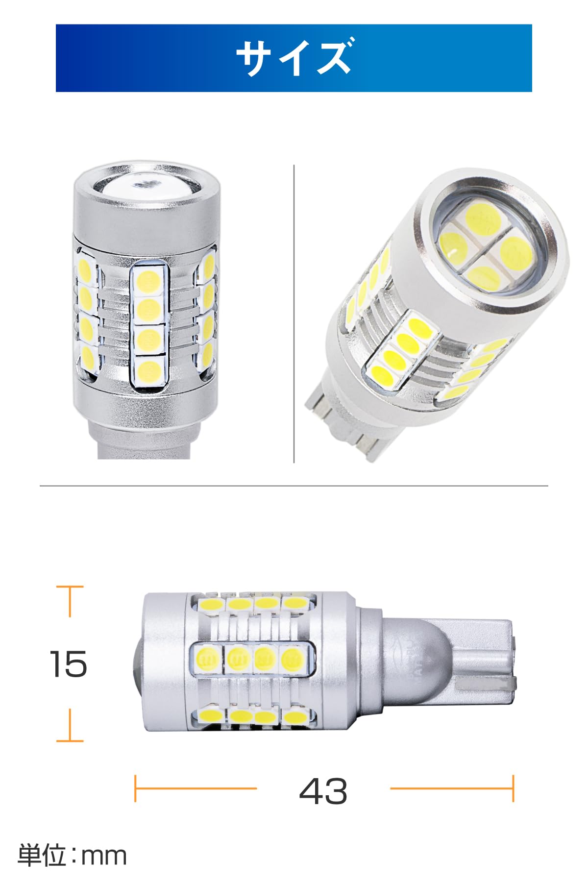 【スペック】色温度6000K / 光束(1球)1800lm(電流及び光束は発熱とともに徐々に抑制されます 冷却後初期値に戻ります) / 電圧:12-30(V) ※12V 軽・普通車専用 直流(DC)のみ対応 / 電流1.3A / 寸法43X15mm / 極性フリー / 定電流ドライバ / 過熱保護設計 / LED2個 説明保証書