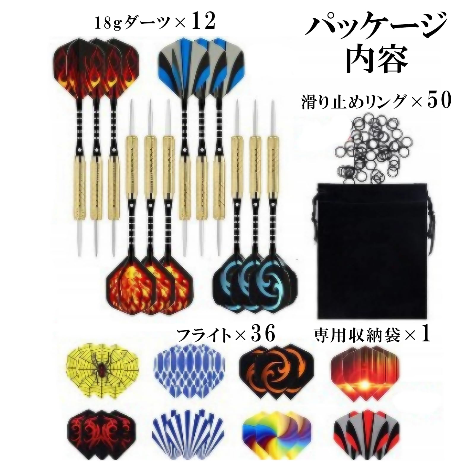 【パッケージ内容】ダーツ×12、フライト×36、滑り止めリング×50、専用収納袋×1、ケース×1【材質】金属鉄+アルミ合金【全長】153mm【シャフトの長さ】48mm【シャフト重量】16g【全重量】18g