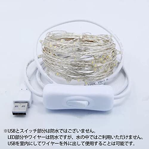 USBから電源を取り、スイッチで簡単にオンオフすることができます。コードが細く目立ちにくいので光が一段と映え、おしゃれな空間を演出します♪<br> コードはワイヤーなので自在に形を変えることができます。そのままの形状をキープすることができるので、吊るすことも引っ掛けることも簡単!ハートや星や文字の形を作って壁に飾ったり、メイソンジャーや飲み終わったワインボトル等に入れ、こなれたインテリア照明を手作りするのもおすすめです♪<br> クリスマスパーティーやハロウィンパーティー、誕生日パーティーを盛り上げることはもちろん、繊細な光だからこそ、間接照明やインテリアとしておしゃれにお部屋を演出できるアイテムとなっております。<br><br><br><br>※USBとスイッチ部分は防水ではございません。<br>LED部分やワイヤーは防水ですので、水に濡れても大丈夫ですが、水の中ではご使用できません。<br>USBを室内にしてワイヤーを外に出して使用することは可能です。