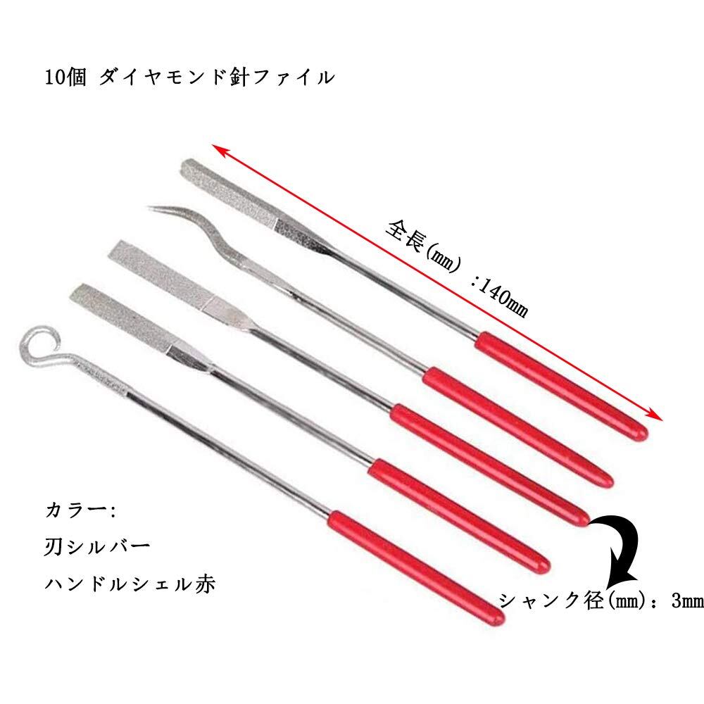 <p>商品:ダイヤモンドヤスリ、木工用ヤスリ10個</p><p>サイズ: 軸径 3mm</p><p> 全長140mm(3*140mm)</p><p>ダイヤモンドヤスリ シャープナー 研磨 研削 ヤスリ 工具 10点 セット</p><p>硬い物の研磨に適した、ダイヤモンド粒子がコーティングされているヤスリです。</p><p>超硬合金 焼入鋼 セラミック ガラス 強化プラスチック 等の硬質材の研削加工に使用できます。幅広い用途:研削、研磨、彫刻、切断、掘削、変更のための、セラミックス、ガラス、クリスタル、金属、超硬、など。 広くのさまざまな金型、モデル、部品、手工芸品や他の産業。</p>