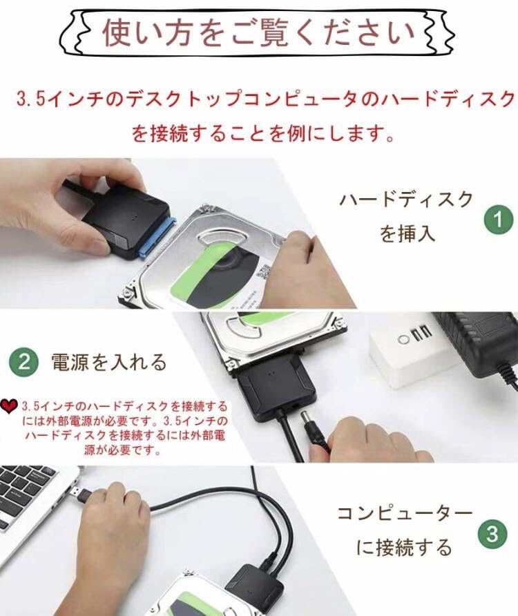 【ご注意】:3.5インチのSATAドライブを接続すると、外部電源アダプターに接続してください。この製品には12V / 2A電源アダプターが付属しています。このUSB-SATA変換アダプターと併用すれば、電力不足の心配がありません。