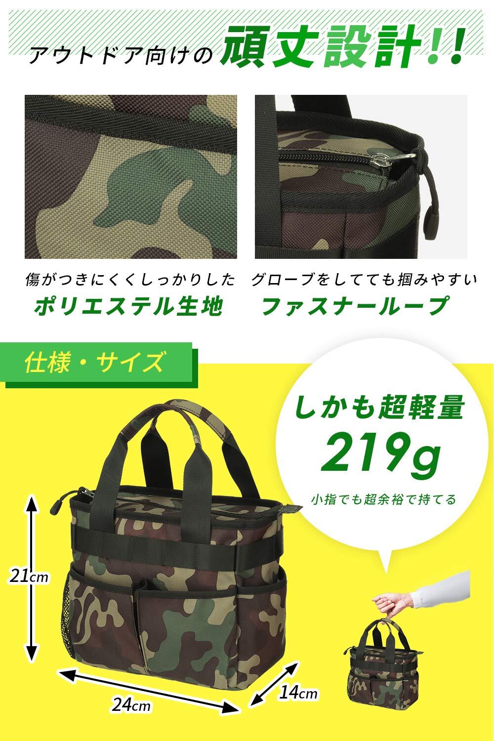 ✅【 しっかりアウトドア品質 】傷かつきにくいポリエステル生地を使用し固めの底なので自立し、グローブをしていても掴みやすいようにファスナーループを付き。しかも重量も超軽量219g!