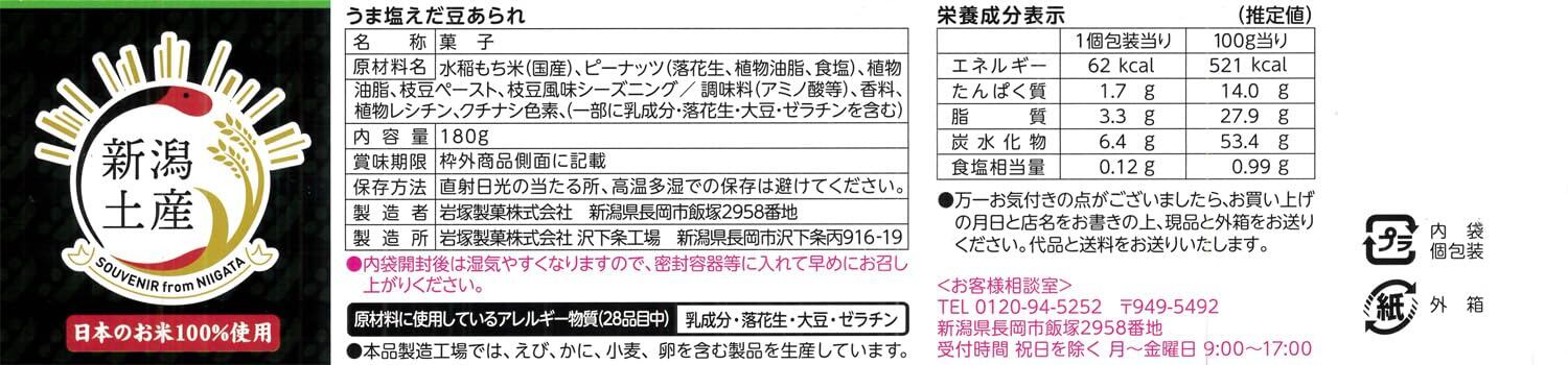 【新潟土産】えだ豆あられ(ピーナッツ入り)もち米にペースト状のえだ豆を練りこみ、枝豆の味がとても濃厚で良い塩加減に仕上がっています。ビールのおつまみにも最適です<br>・内 容 量 : 180g(個包装14袋入)<br>・賞味期限: 商品の裏面に記載<br>・保存方法 : 直射日光、高温<br>・多湿の場所を避けてください。<br>・原 材 料 : 水稲もち米(国産)、ピーナッツ、植物油脂、枝豆ペースト、枝豆風味シーズニング、食塩、調味料(アミノ酸等)、香料、クチナシ色素、(原材料の一部に乳成分・落花生、大豆、ゼラチンを含む)