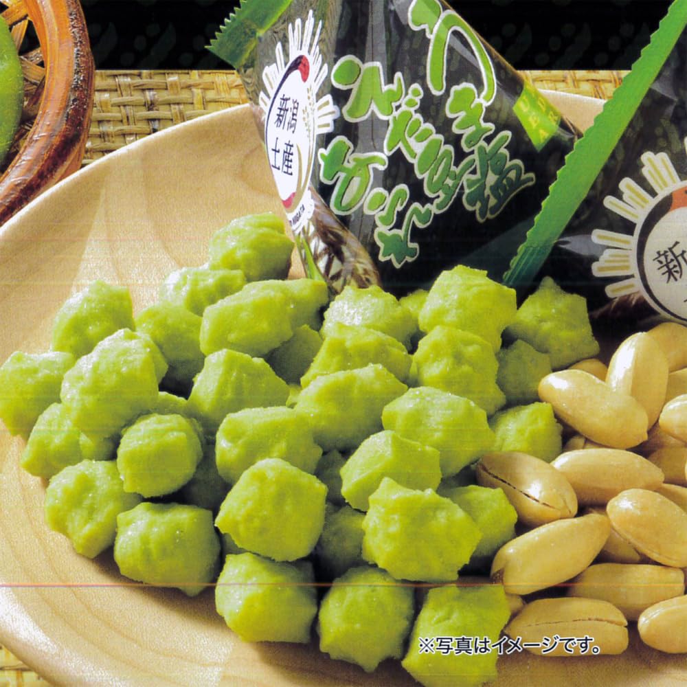 【新潟土産】えだ豆あられ(ピーナッツ入り)もち米にペースト状のえだ豆を練りこみ、枝豆の味がとても濃厚で良い塩加減に仕上がっています。