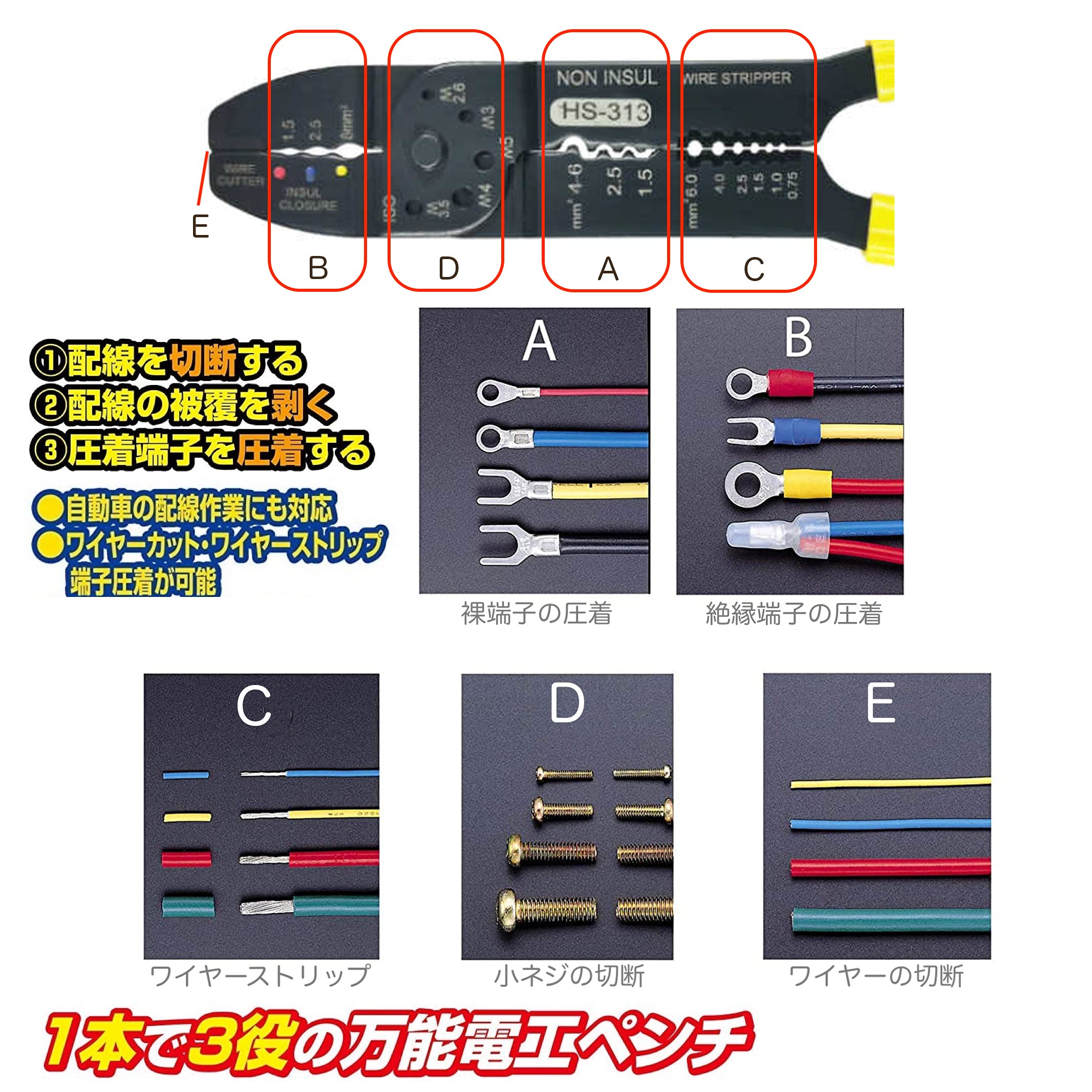 電工ペンチ、電線ストリッパー、切断機能 全長約215mm<br> クルマ、バイクの電装品取り付け作業。配線作業にお薦め。<br> 端子圧着、電線ストリッパー、カッター、ボルトカットとして使用可能。<br> <br> 【製品詳細】<br> 本体全長 215mm<br> 本体重量 220g<br> <br> 機能<br> 電線ストリッパー 0.75〜6sq<br> 裸端子端子圧着 1.5〜6.0sq<br> 被覆端子圧着 1.5〜6.0sq<br> ネジカット M2.6〜M5<br> 一般電線カッター<br> <br> <br> 商品紹介<br> 圧着作業のあらゆるフィールドに対応できる多機能型圧着ペンチ。<br> 裸端子・絶縁端子用。<br> 自動車の整備、工場のメンテナンス、電話の配線、各種ホビー、オーディオ、テレビ、その他家電機器。<br> 安全の為に保護メガネを着用して作業して下さい。切断物が飛び散りますので、周囲に人や壊れやすい物がないことを確認してから作業して下さい。<br> 硬い材質、ピアノ線などの切断に使用しないで下さい。<br> 焼入れ処理された硬度の高いネジ、ボルトネジ (クロムモリブデン鋼など) またはSUSネジの切断は、製品本体を破損させる場合があります。<br> <br>