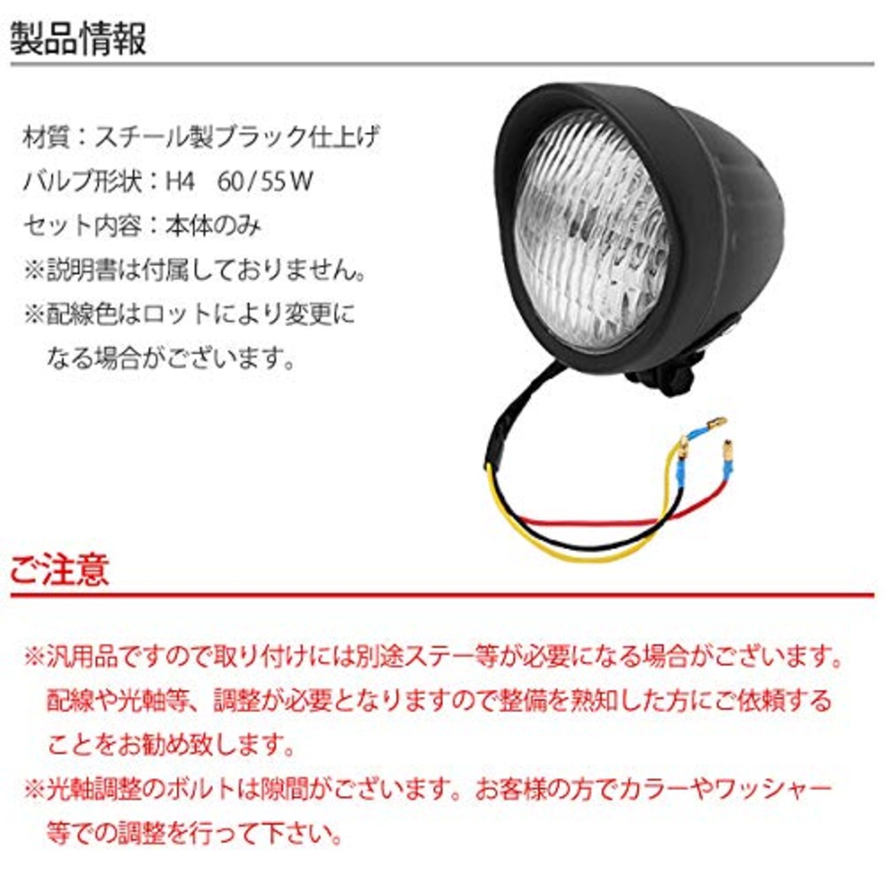 商品情報<br>オールドタイプの4.5インチベーツタイプ ヘッドライトです。<br>マルチリフレクターではなくカット入りのレンズを使用することでクラシック感を演出し、H4バルブを使用することで暗い峠道なども明るく照らしてくれます。<br><br>ご注意<br>※汎用品ですので、取付けには別途ステーなどが必要になる場合がございます。<br>※配線や光軸など調整が必要となりますので、整備を熟知した方にご依頼することをお勧め致します。<br>※光軸調整のボルトは隙間がございます。お客様の方でカラーやワッシャーなどでの調整を行って下さい。<br>※防水処理は施されておりません<br><br>製品情報<br>材質:スチール製ブラック仕上げ<br>レンズ:クリア<br>取り付けネジ径:10mm<br>バルブ形状:H4 60/55W<br> <br>※説明書は付属しておりません。<br>