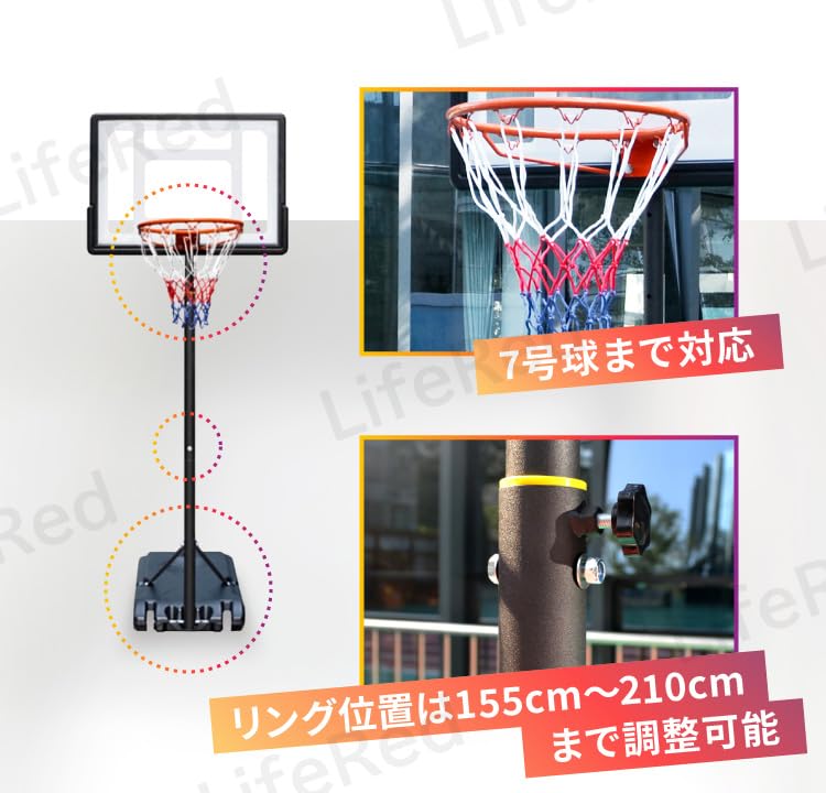 【LifeRed】 バスケットゴール 7号球対応 (屋外 室内 練習用 バスケット ゴールネット リング 子供 こども用 一般用 家庭 ミニバス/ミニバスケットボール対応 高さ調節可能 移動式)