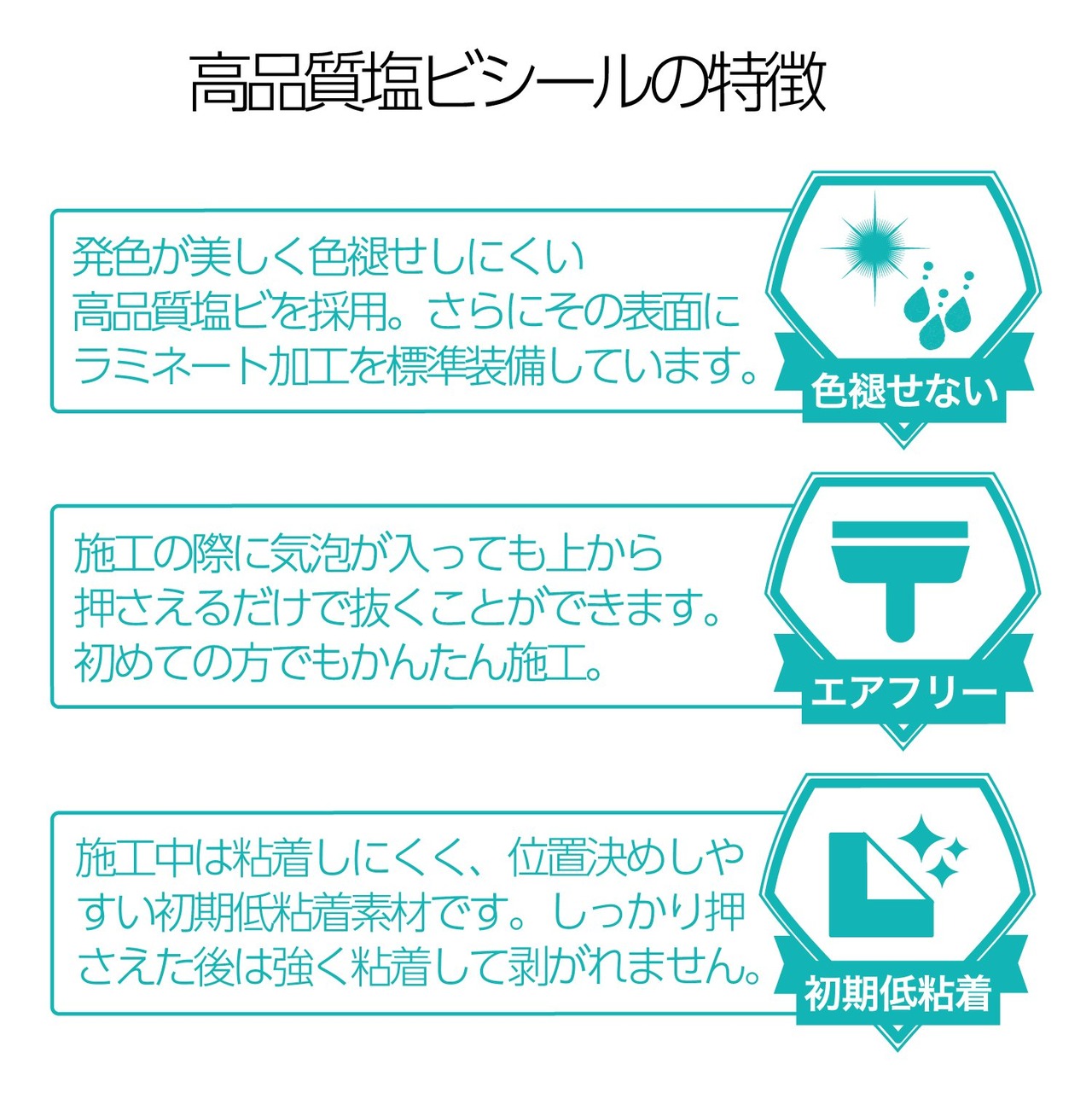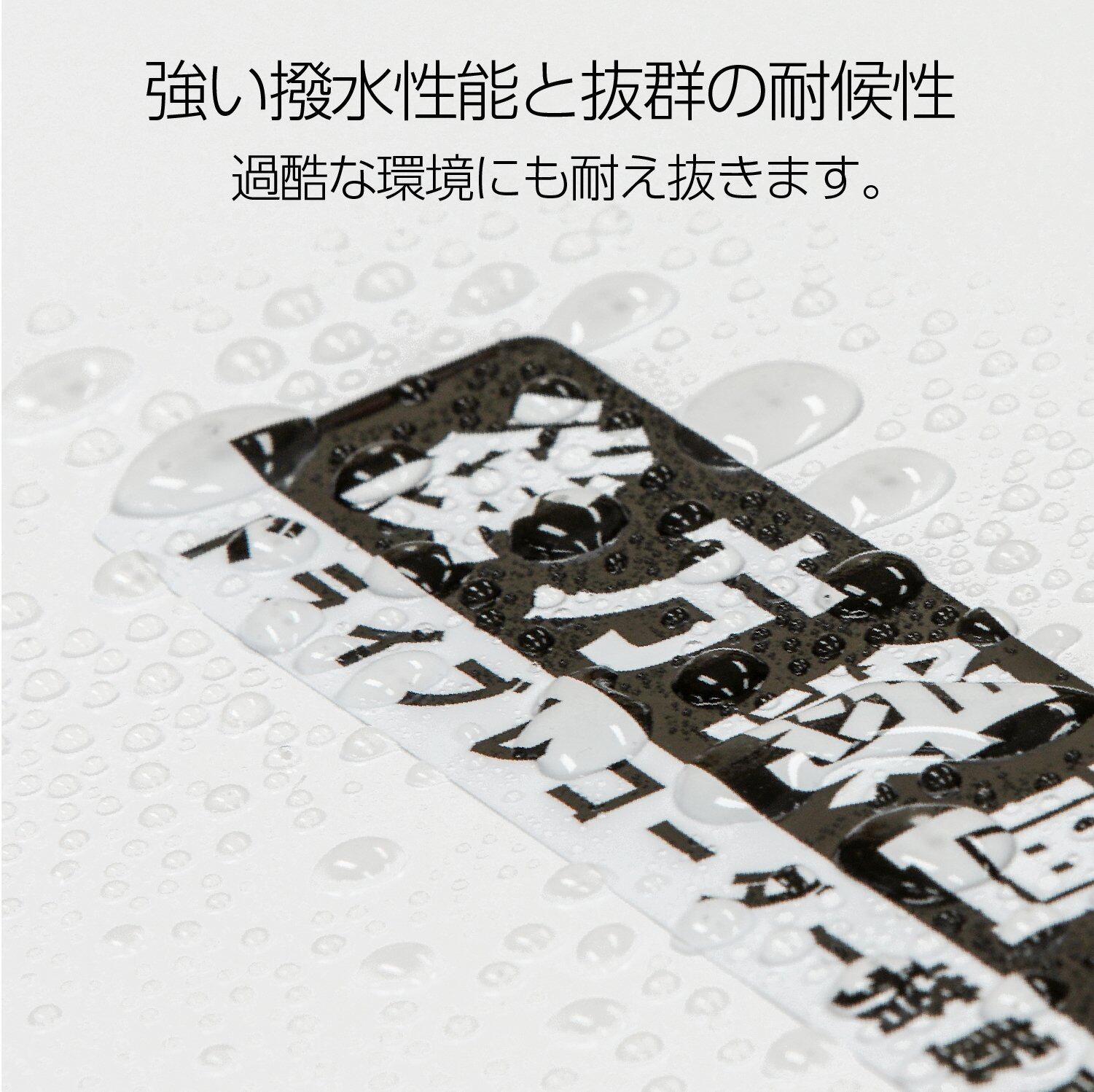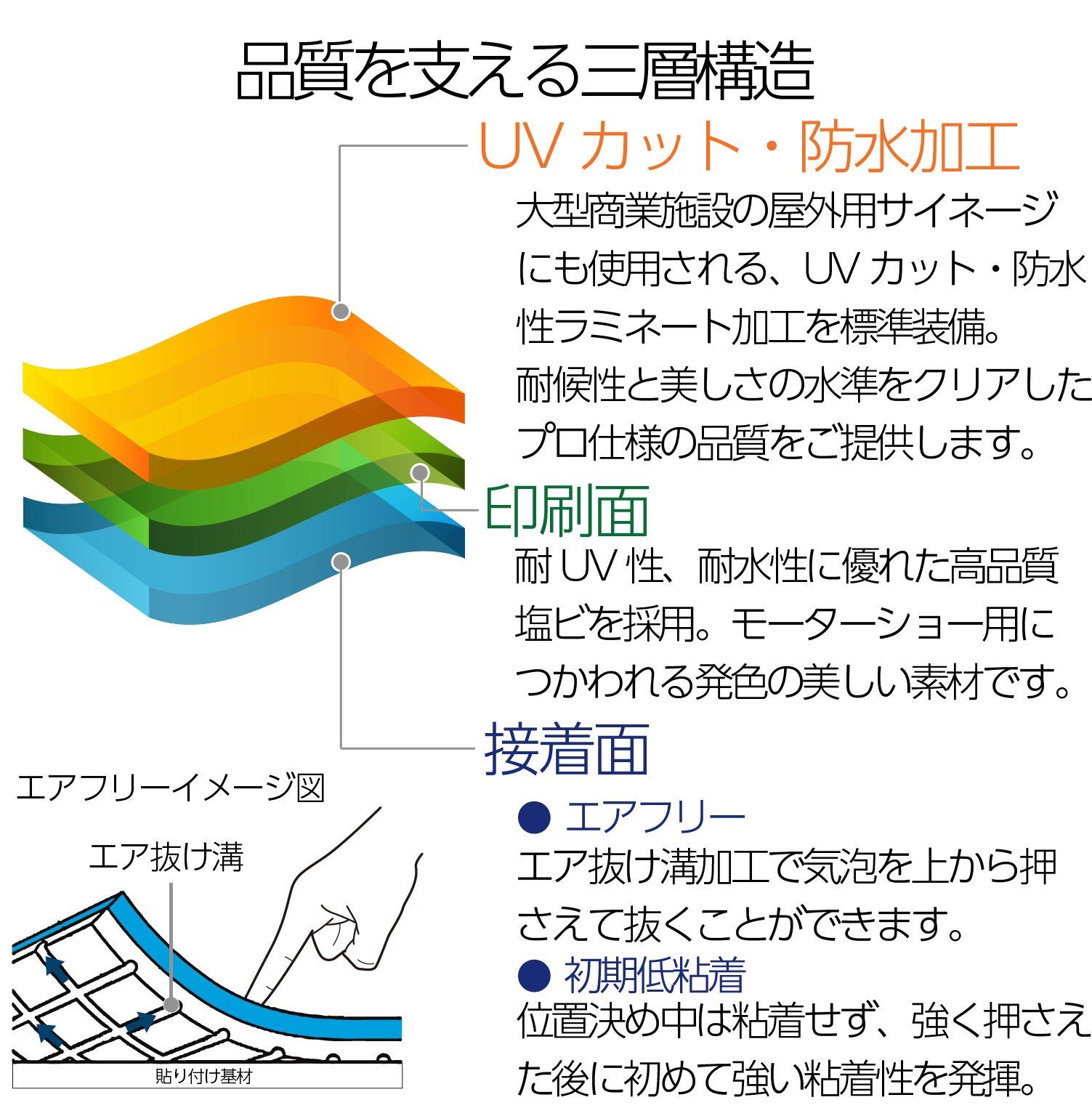 【高い耐候性】表面加工に使用している高品質塩化ビニル素材は、炭素鎖の1個おきに塩素原子が結合した分子構造を持ち、酸化反応に対して極めて強いです。垂直面で約5年の屋外耐候性があります。さらにUVカット・防水性能つきのラミネート加工を施し、劣化を防いでいます。