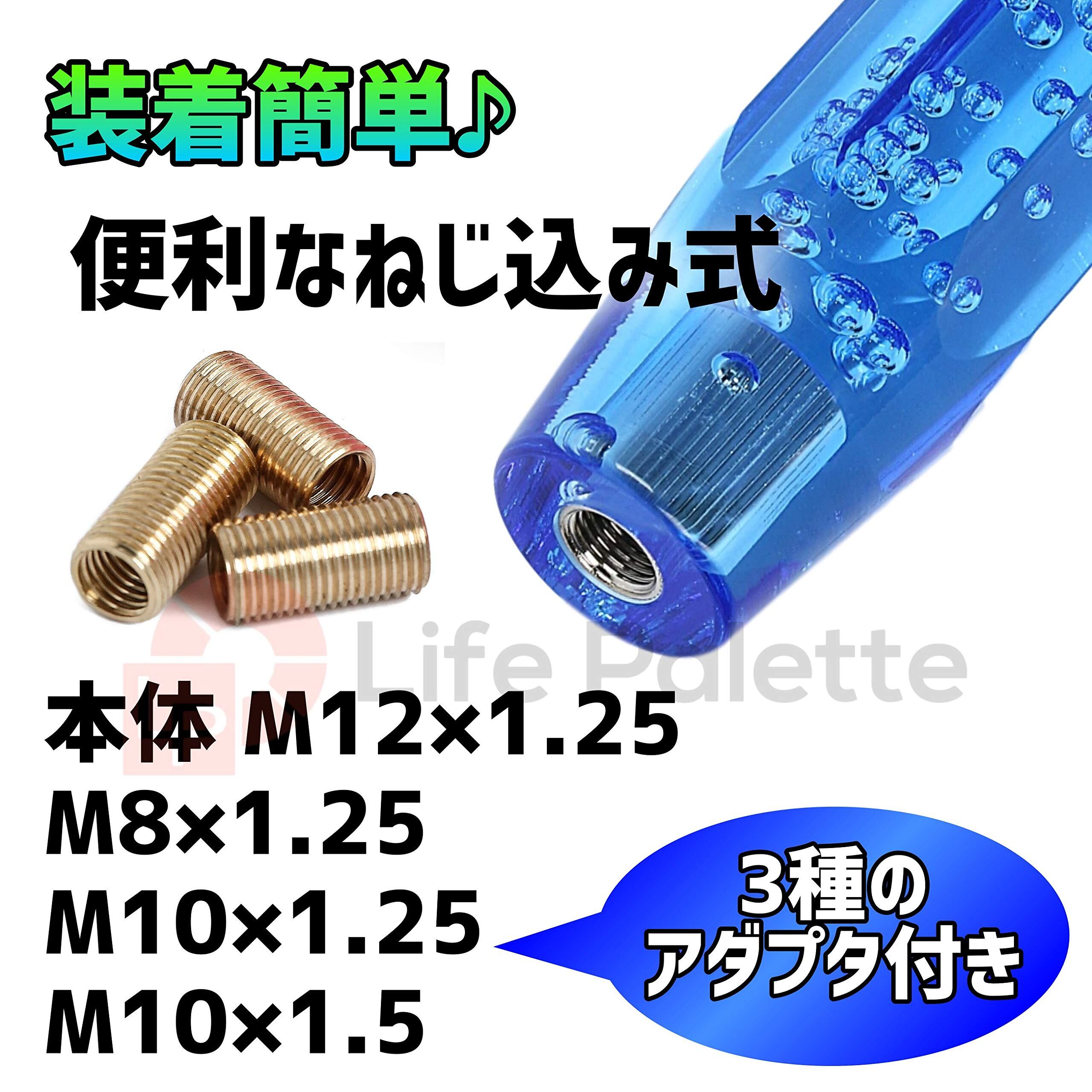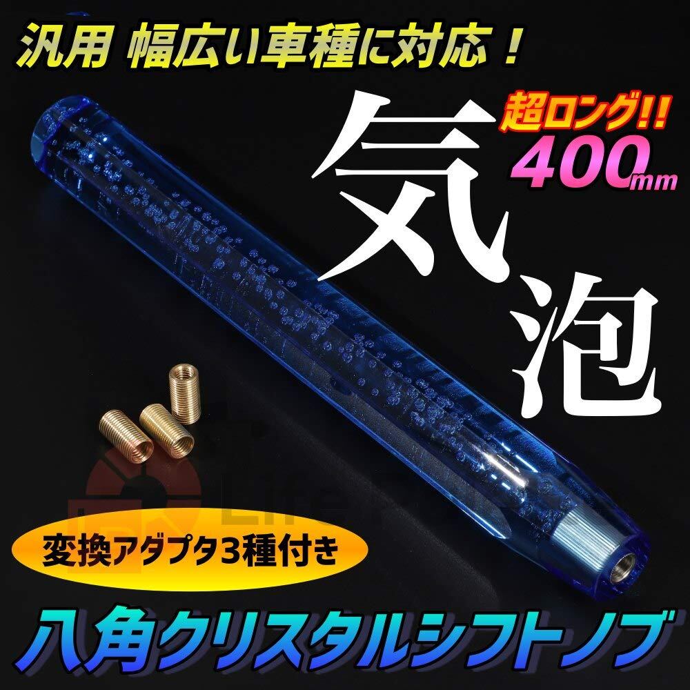 汎用 クリスタルシフトノブ 泡入り 気泡 八角 400mm バブル ゲートAT車/MT車対応 アダプター付き 大半国産車対応 普通車 軽自動車 GE77 ・カラー【レッド/パープル/ブルー】 ・セット内容【シフトノブ×1(M12×1.25)、スレッドアダプタ×3(M8×1.25、M10×1.25)】 商品説明 【雰囲気一変】 気泡&グラデーションが美しく幻想的なクリスタルシフトノブ。 光に当たるときらきらと反射し、高級感のある印象に。 これを取り付けるだけで、車内の雰囲気を一変させます。 車内のドレスアップに最適の商品です。 【快適にシフトチェンジ】 適当な重量感をもち、長さはロングタイプの400mm。 シフトチェンジがスムーズに進みます。 快適なシフトチェンジでドライブを楽しみましょう! 【車種広く対応】 商品本体のネジ径はM12×1.25、付属のアダプター3点のネジ径はM8×1.25、M10×1.25 汎用品のため、ほとんどのトヨタ/スバル/スズキ/ダイハツ/ニッサン/マツダ/ミツビシ/ホンダ車に対応できます。 ※一部例外がございます。 【簡単取付】 ねじ込み式なので、イモネジで締め込むだけで簡単に取り付けます。 材質:アクリルプラスチック パックケージ内容:シフトノブ×1(M12×1.25)、スレッドアダプタ×3(M8×1.25、M10×1.25) 長さ:400mm