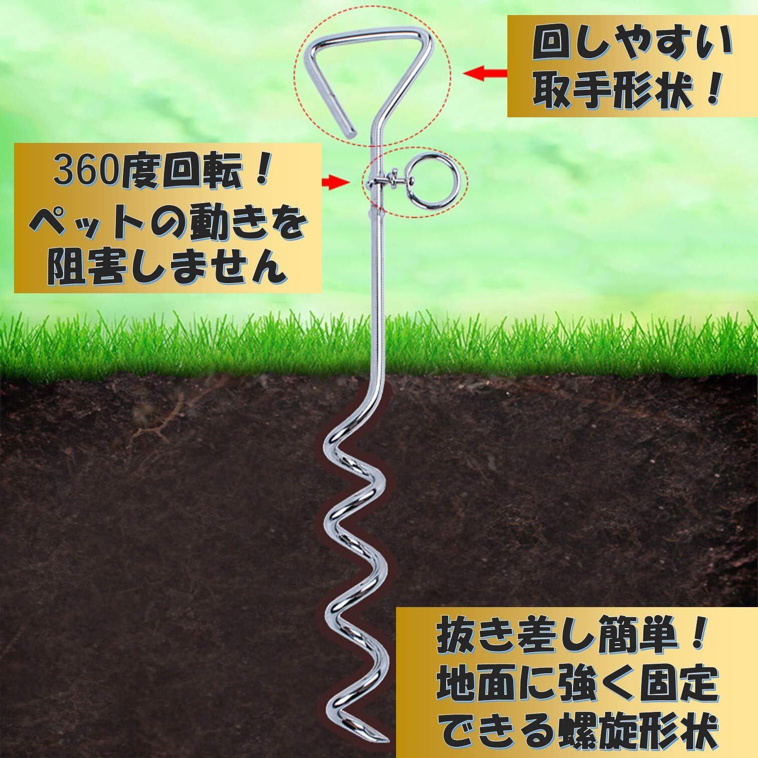 係留ステッキは螺旋型形状となっているので簡単に地面に抜き差しできる上に固定力が抜群です。ワイヤーリードを付ける部分は360°回転可能なリングとなっているのでペットの動きを邪魔せず安全です!