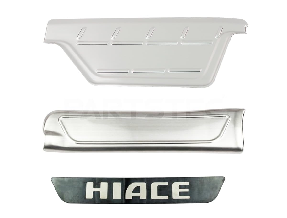 <b>製造時、輸送時のキズ防止のため、保護フィルムが貼り付けられております。フィルムを剥がしてご使用ください。</b><br><br><b>【 商品詳細 】</b><br> ■200系ハイエース・レジアスエース 専用設計<br> フロント用 ステップガード<br> <br> ・用途:ステップ 汚れ 傷防止 ドレスアップ<br> ・素材:ステンレス製<br> ・カラー:本体:シルバー プレート部分:ブラック<br> ・取付:両面テープ ※ステップの上から貼付<br> <br> <b>【 セット内容 】</b><br> ・スカッフプレート セット x1<br> ※2P左右4枚セットになります。<br> ※取扱説明書等は付属しておりません。<br> <br> <b>【 参考適合 】</b><br> ■トヨタ<br> ハイエース/レジアスエース<br> 200系 1型 2型 3型 4型 5型 6型 H16.8 以降~<br> S-GL DX 標準 ワイド 全グレード共通<br> <br> ■マツダ<br> ボンゴブローニイ<br> 200系 ハイエースベース GL DX<br><br>※寒冷地仕様は形状が異なる為、不適合 <br> <b>【 注意事項 】</b><br> ※純正部品ではございません、取付前に仮合わせ・点灯確認を行って下さい。<br>※専用品ではございますが、使用に問題無い程度の若干の浮きが発生する場合がございます。予めご了承ください。<br> ※汚れ・油分などを脱脂クリーニングで全て落とし、本取付を行って下さい。<br> ※必ず画像と現車の形状のご確認をお願いします。<br> ※取扱説明書等は付属しておりません。<br> ※商品の配線を加工された場合などの点灯不良に関しましては保証対象外になる場合がございます。<br> ※本商品は検品後の発送となりますので開封の跡が残る場合がありますがご理解下さい。<br> ※新品ですが海外製品になりますので、輸送中の傷や汚れがある場合も御座いますがご理解下さい。<br> ※取付けに関してのサポートは行っておりませんので、自信のない方は専門業者にて<br> お取り付け下さい。<br> ※取付けに関する工賃等につきましてはお客様ご負担となります。いかなる場合でも工賃等の<br> 保証はございません。<br> ※取り付けは自己責任でお願いします。取り付けの際の破損等も当方では責任を負いかねます。<br> ※万が一本製品により生じた事故・障害・損害等は、弊社では一切の責任を負えませんので<br> あらかじめご了承下さい。<br> ※初期不良の場合、商品到着後7日間以内に限りご対応とさせていただきます。<br> お早目に動作確認の方よろしくお願い致します。<br> ※ご購入の際は、すべての注意事項をお読みになり、ご同意の上ご購入下さいますよう<br> お願い申し上げます。