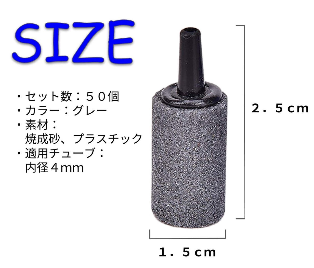 ・【サイズ】直径15mm、全長25mm。内径4mmのチューブに適しています。<br>・【パッケージ内容】円筒形エアストーン×50個 【重量】約8g(1個)<br>・【ジェット容量】0.8L/分 【推奨エアポンプパワー】2W以上<br>・魚類・植物の生育環境をグレードアップできるエアストーンです。環境にやさしい材料を採用しており、生き物の寿命を延ばし、お魚に健康な環境を作成するのに役立ちます。<br>・水族館、水槽、魚タンク、水培システム、池、金魚鉢など、その他の水基システムに適用します。 ※エアストーンを約1時間水に完全に浸してからご使用ください。