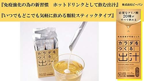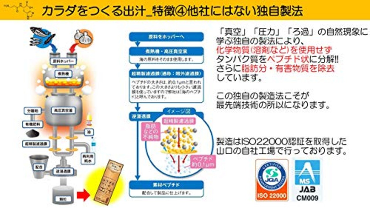 いつでもどこでも気軽に飲める顆粒スティックタイプ。スティック1本(5g入)で必要なアミノ酸20種すべて摂れる。原料は国産のイワシ、カツオ、昆布、無臭ニンニクを使用しております。イワシやカツオは頭から骨、内臓、目玉まで全て使用し、化学処理を一切加えずにアミノ酸を低分子状態のペプチドにしました。「真空」「圧力」「ろ過」の自然現象に 学ぶ独自の製法により、化学物質(溶剤など)を使用せずタンパク質をペプチド状に分解。さらに脂肪分・有害物質を除去しています。コップ1杯(約200cc)のお湯にスティック1本溶かせばホットドリンクとしてお飲み頂けます。ペプチドなので、カラダに負担をかけず効率よく栄養を吸収。アレルギー28品目や食塩、酵母エキス等の添加物は一切不使用の為、お子様からお年寄りや療治中の方まで幅広く安心安全にご利用頂けます。料理研究家監修のレシピも掲載しておりますので、贈り物として受け取ったお客様にもご好評をいただいております。