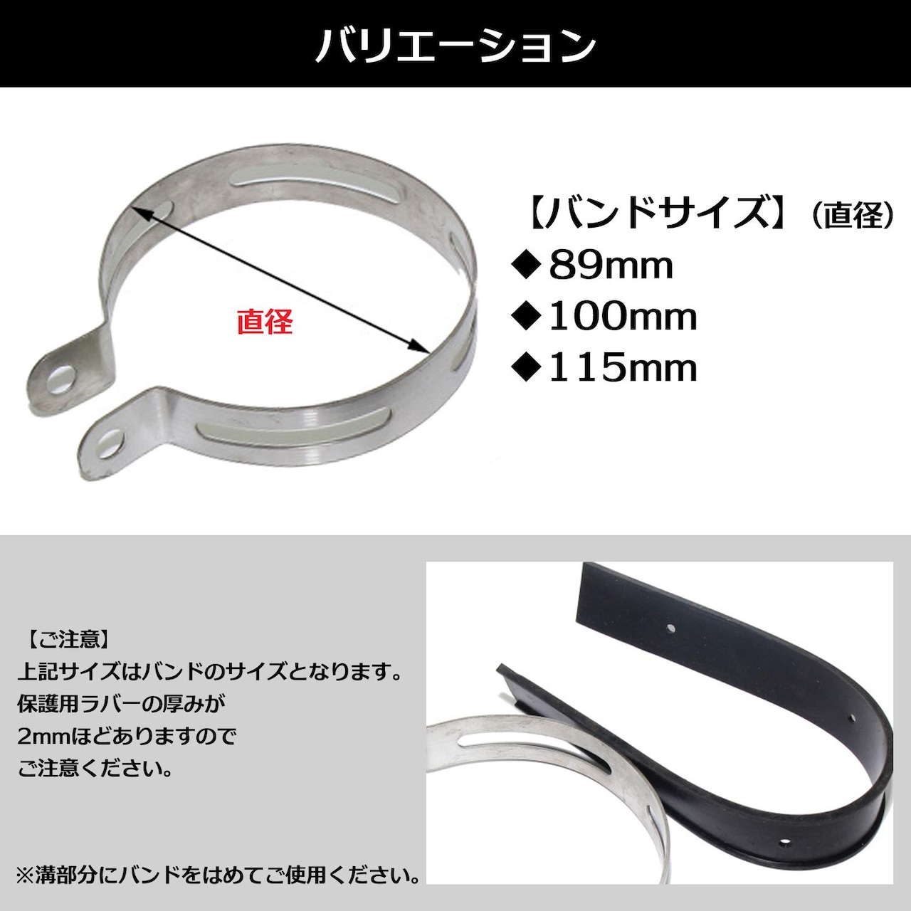 サイレンサーバンドは、カスタムマフラーを装着したバイクに適した固定バンドであり、さまざまなサイズのマフラーに対応できるよう設計されています。バンドのサイズは約89mm、約100mm、約115mmの3種類があり、適切なサイズを選択することで、確実な取り付けが可能になります。これにより、マフラーをしっかりと固定し、安全性と安定性を向上させます。
