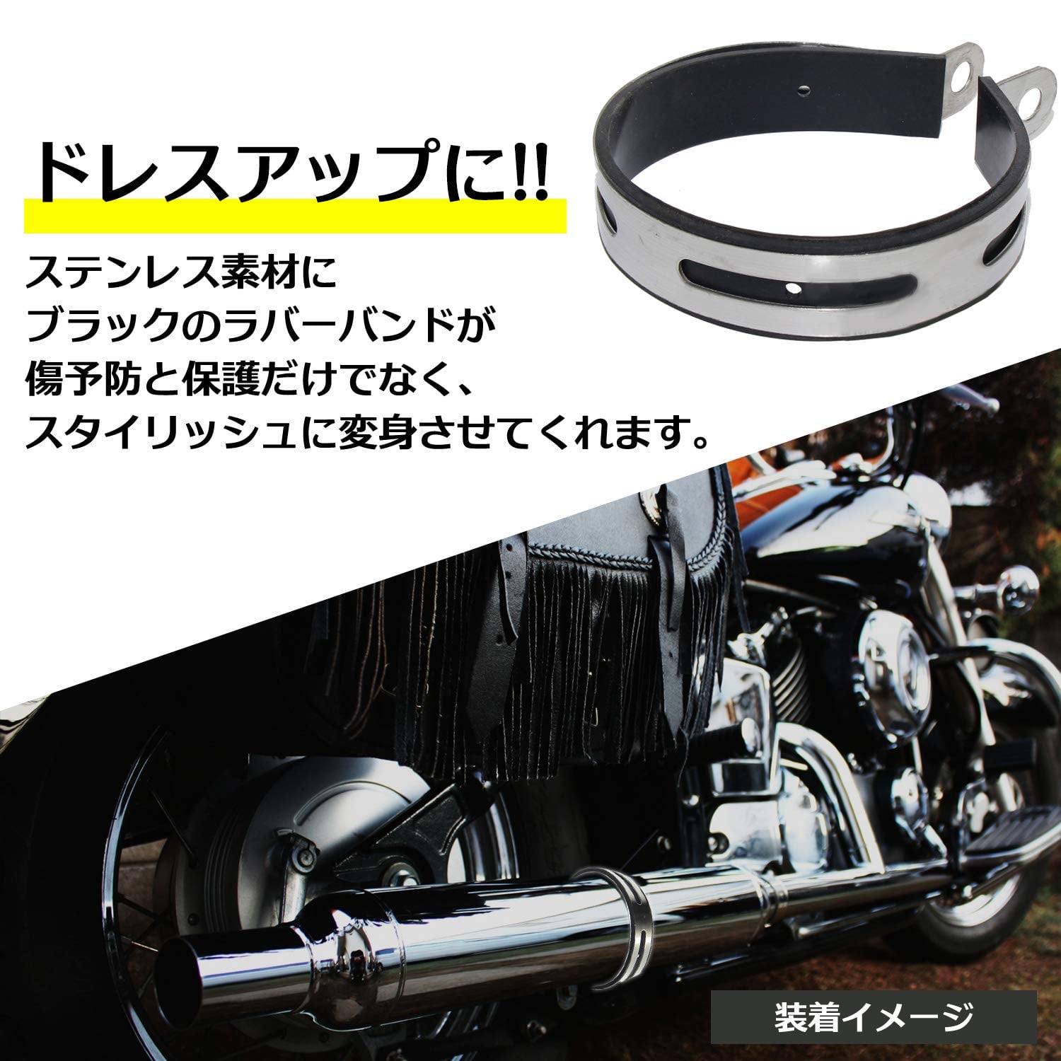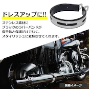 ステンレス製のバンドは耐久性に優れ、長期間の使用が可能です。バンドの内側には黒い保護シートが施されており、マフラーへの傷つきを防ぐ設計となっています。これにより、バイクの外観を損なうことなく、しっかりとマフラーを固定することができます。また、マフラーステーとしても活用でき、バイクのマフラー固定に理想的な選択肢となります。