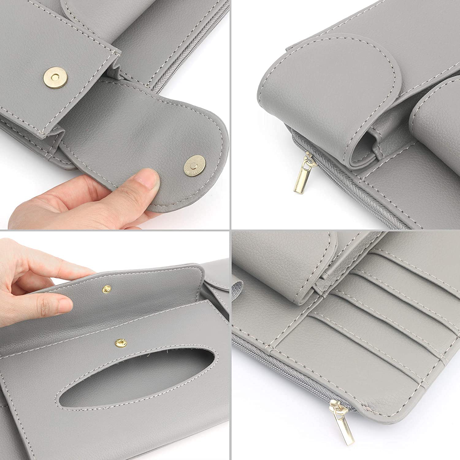 サンバイザー ティッシュカバー、車 ティッシュカバー カー 車ティッシュホルダー、サンバイザーポケット、メガネホルダー PUレザー カード ペン 小物収納セット(グレー)