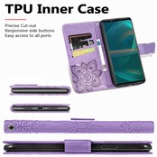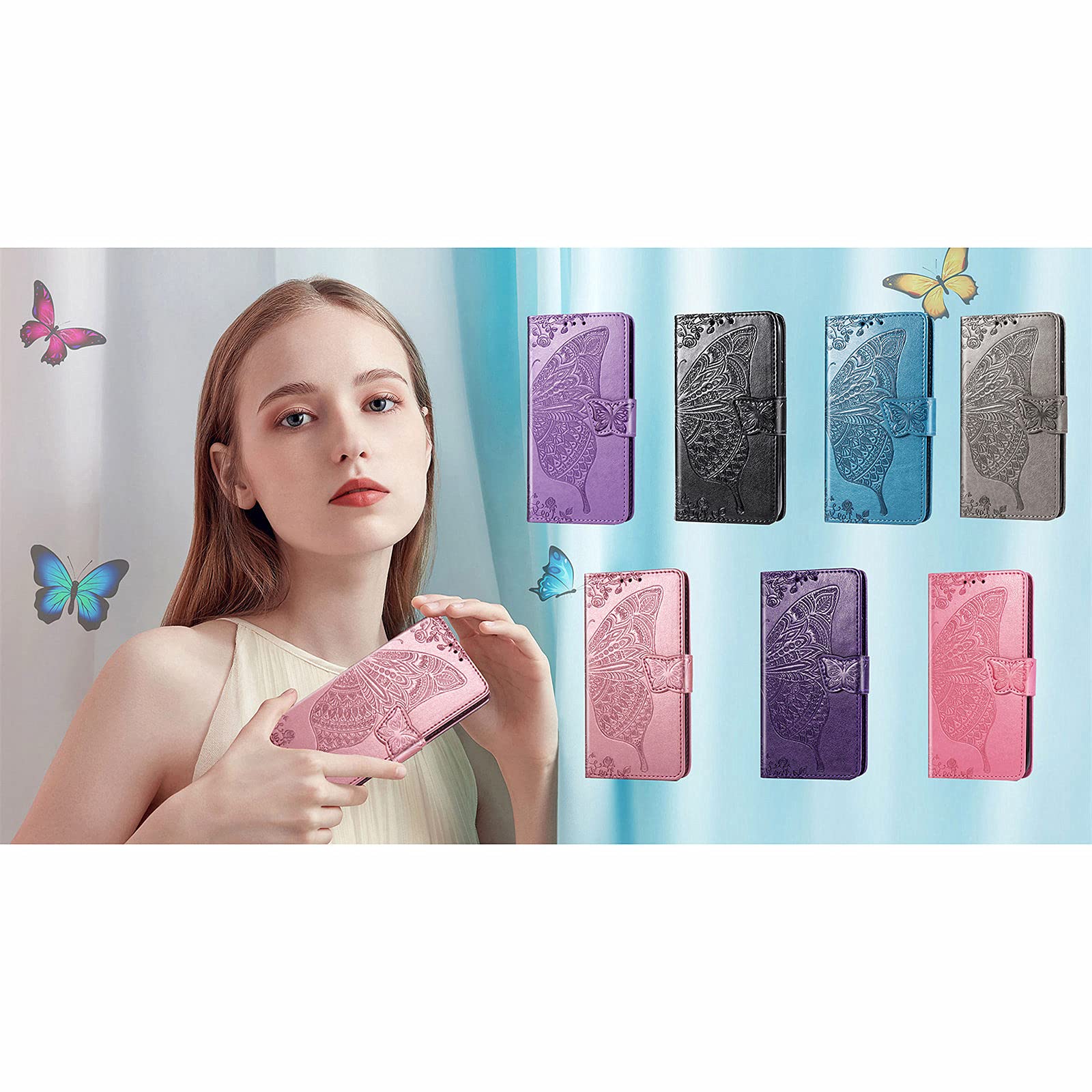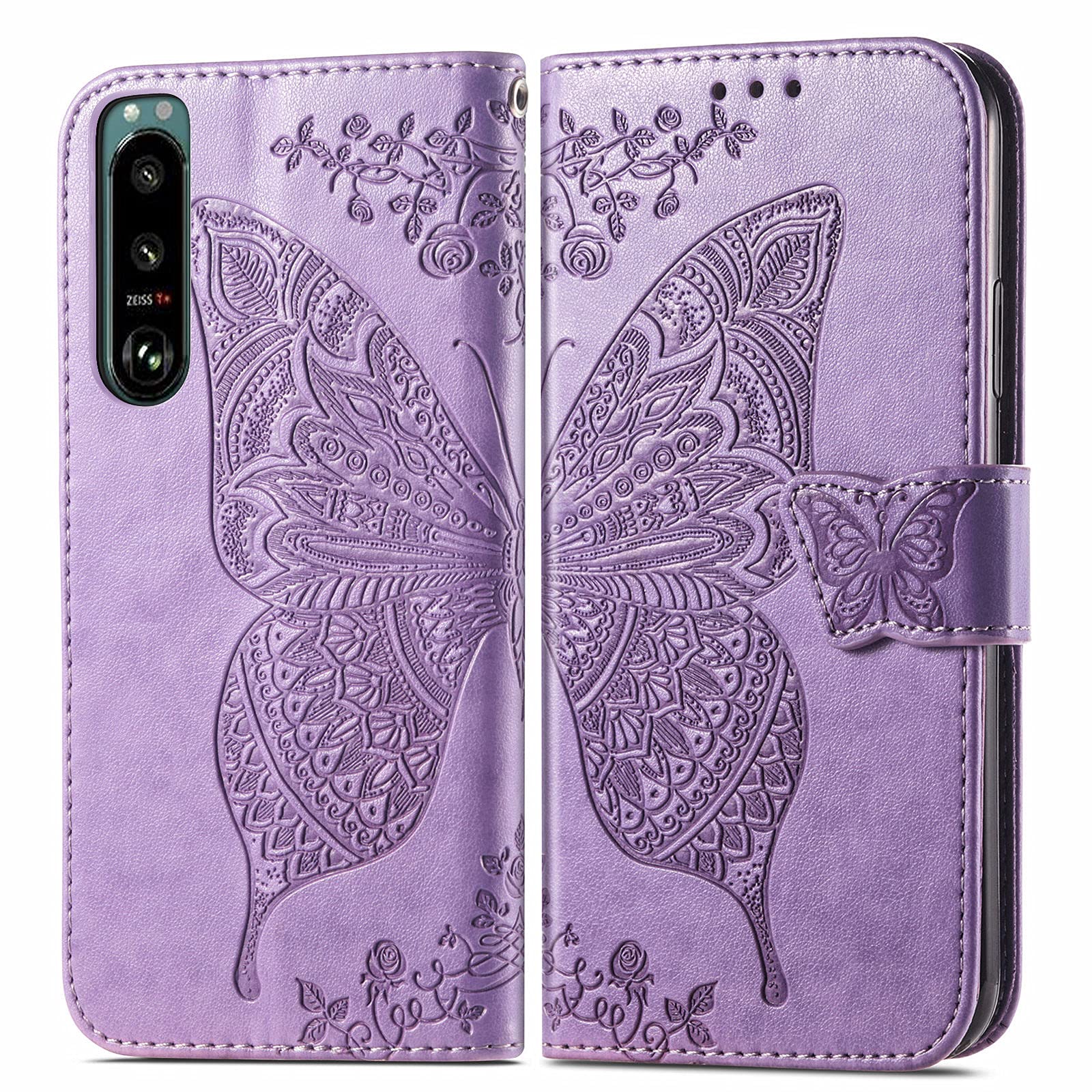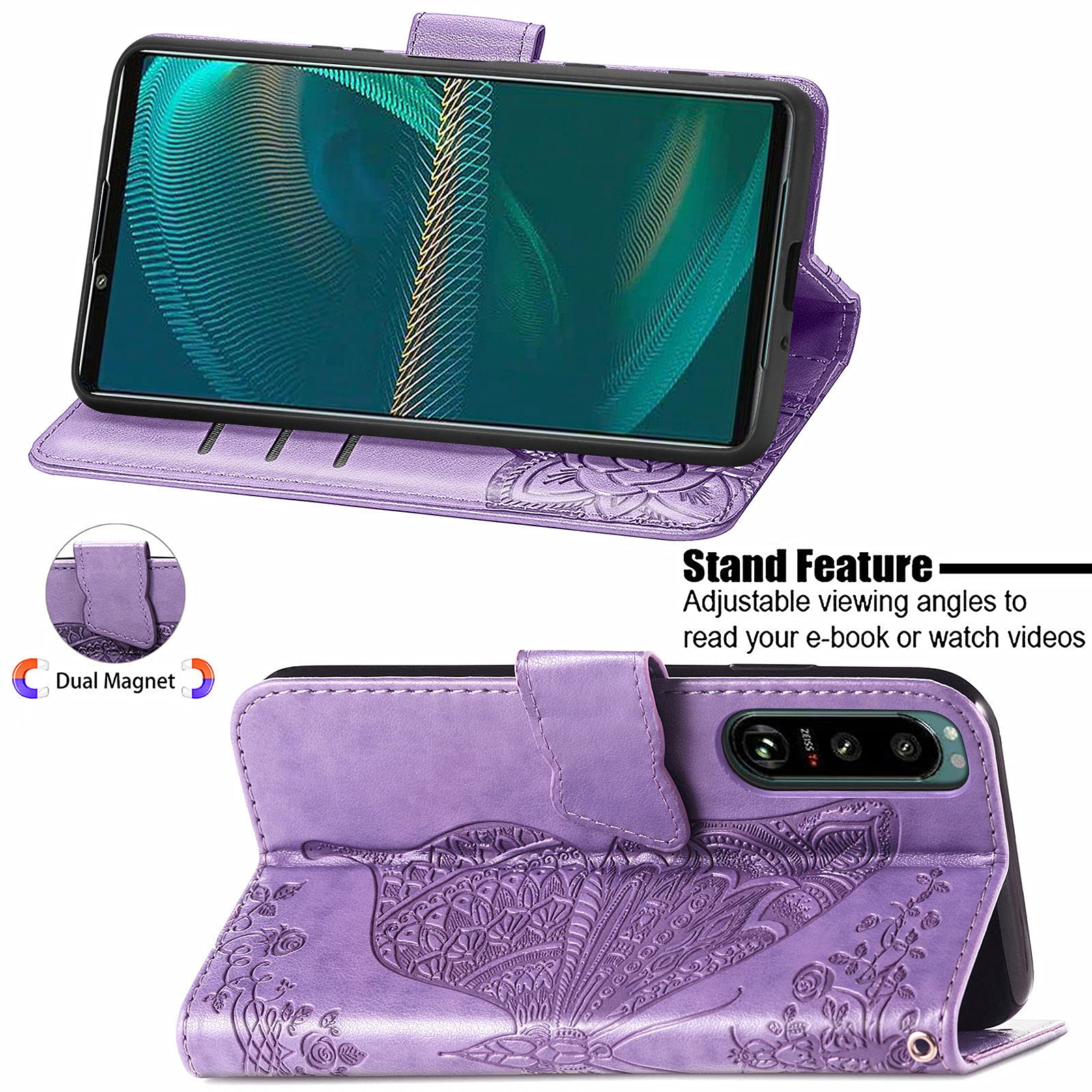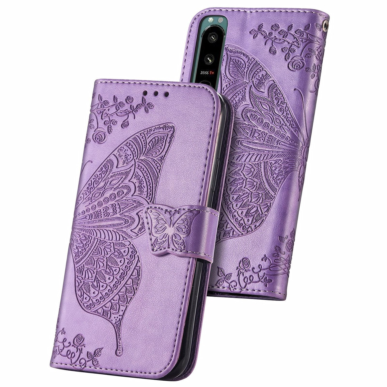 Xperia 5 III ケース【Trocent】Xperia 5 III ケース エクスペリア 5 III ケース マグネットロック スタンド機能付き カード収納 ストラップホール 手帳型 全面保護 衝撃防止 蝶々図案 (紫色)