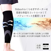 様々な使用シーン スポーツでも日常生活でも ランニング・ウォーキング・バスケット・バレーボール デスクワーク・立ち仕事・運転・家事 熱発散・保温のコントロール パフォーマンスを高めるため、体温のコントロールをサポートする機能性素材を採用 360°伸縮の3D設計 特殊素材による3Dコンプレッション設計が筋肉の過剰な揺れを抑制しエネルギーロスを減らします。 UVカット&抗菌防臭加工 アウトドアスポーツでも快適にご利用いただける機能です。 日本メーカーだからこそのアフターケア Nithra ニスラ ご購入後の保証がございますので、初期不良やサイズが合わない場合はご連絡くださいませ。 【足のむくみと疲れの関係性】 心臓から送り出された血液は動脈を通って身体中をめぐって、静脈を通って心臓に戻ります。心臓から1メートル下の足をめぐった血液は重力に逆らって心臓に戻ります。血液を下から上にあげるにはポンプが必要です。地下水をくみ上げるポンプのように心臓は下半身の血液を吸い上げます。その時にふくらはぎの筋肉がポンプのように収縮する事で、血液を心臓に送り返す手助けをします。 しかし疲れたり同じ姿勢でいると、この機能も低下してしまい、足に血液がたまりやすくなることで、足がむくんだりだるくなるということにつながってしまうのです。 【疲労の原因は筋肉の振動?】 筋肉は運動をしたり、衝撃を受けたりすることで振動します。 人のカラダは無意識にこのムダな動きや振動を抑えようとするチカラが働きます。この働きがスタミナロスやパフォーマンスの低下につながり運動効率を悪くしている恐れがあります。 主要な筋肉であるふくらはぎに適度の着圧を与えて筋振動を抑えることで疲労感を減らしたり、足がつることなどの予防サポートが期待できます。