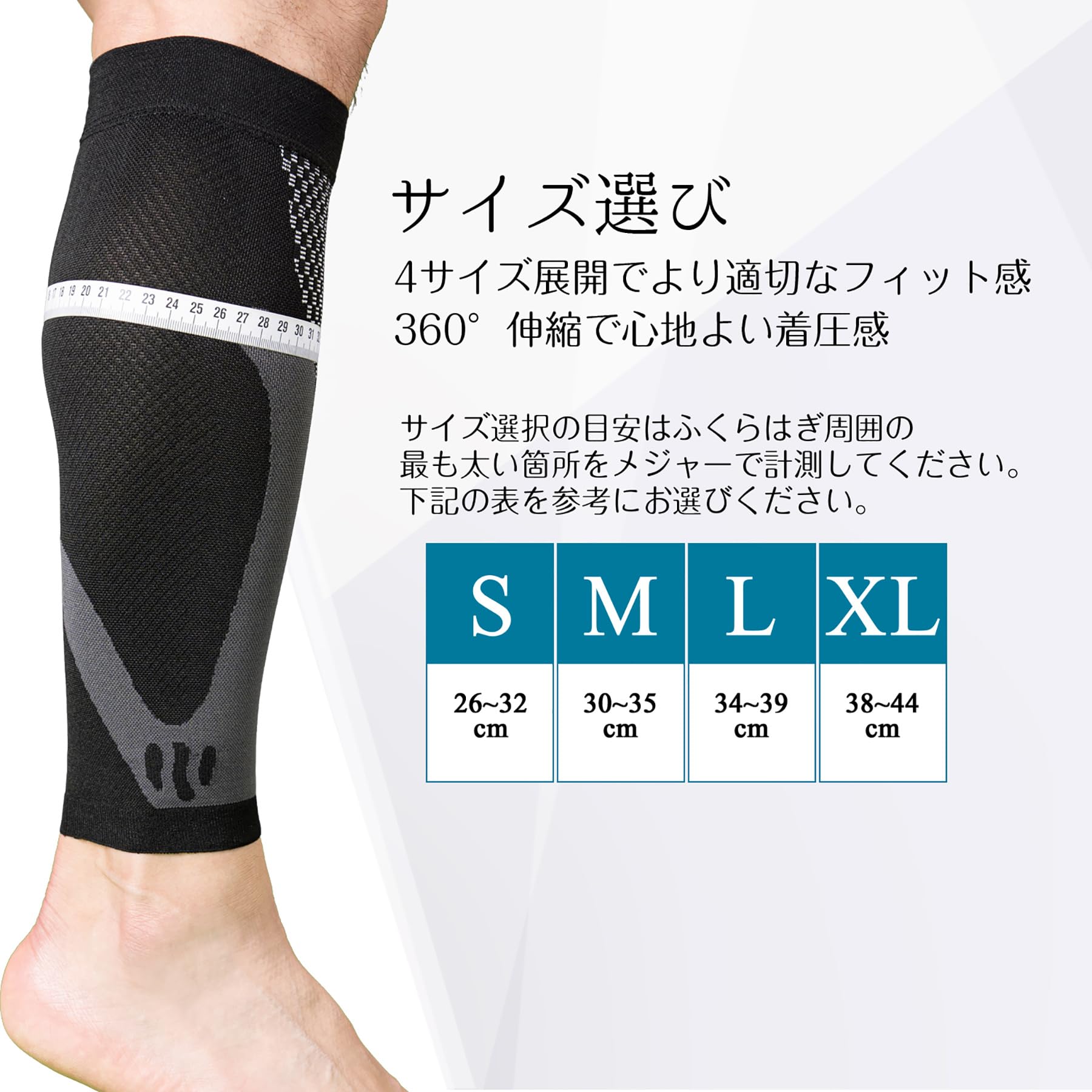 【サイズ選び】サイズ選択の目安はふくらはぎ周囲の最も太い箇所をメジャーで計測して、次の数値を参考にお選びください。S:26-32cm M:30-35cm L:34-39cm XL:38-44cm 4サイズ展開でより適切なフィット感 360°伸縮で心地よい着圧感。ウォーキング テニス 登山 バレーボール バスケ ランニング バドミントンなどの運動をはじめ、 デスクワーク 座り仕事などの日常生活でも活躍します。