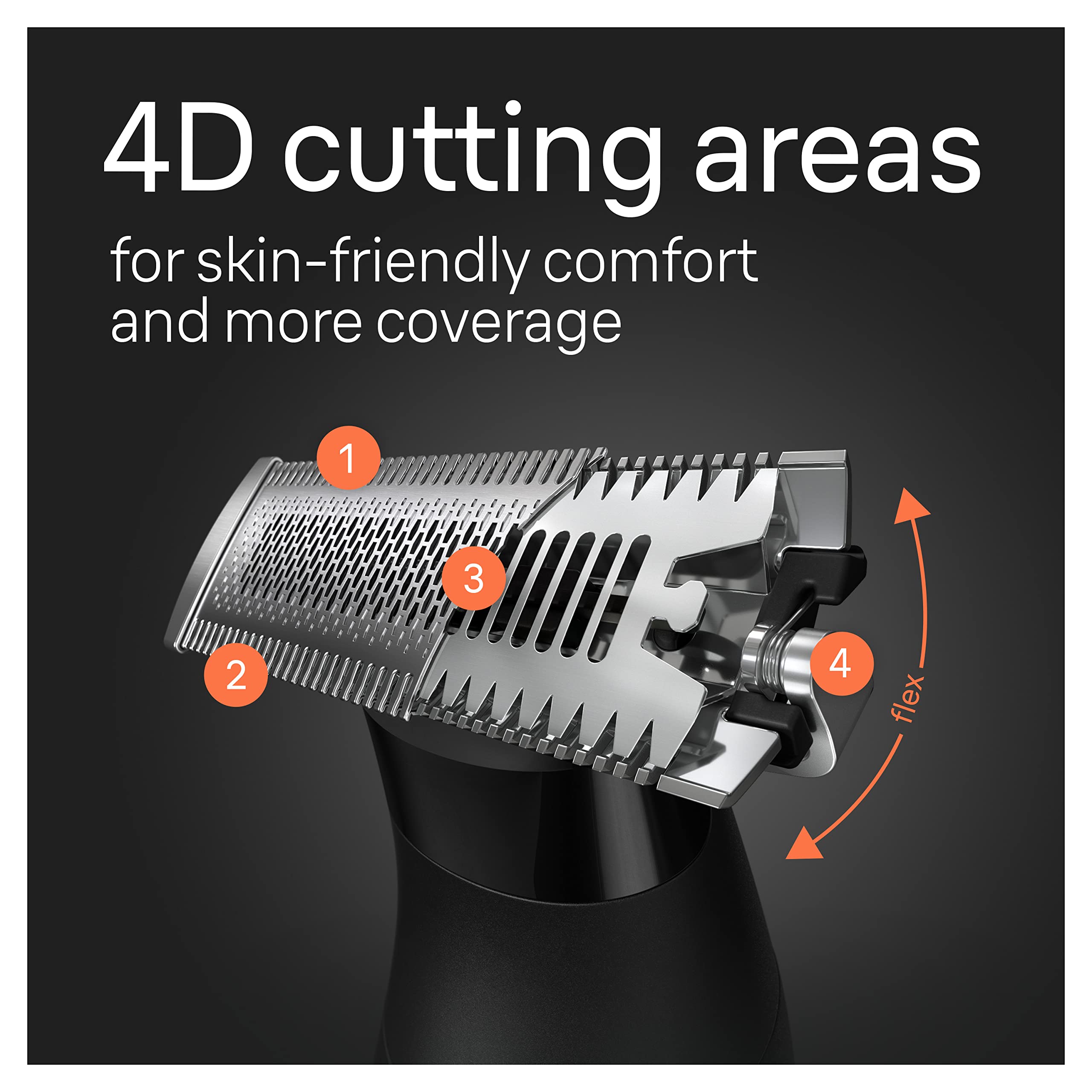 ブレードは2つのサイドトリマーと2つの中央シェービングゾーンを備えています-毎秒450回の動きで肌にやさしい密着シェービング。