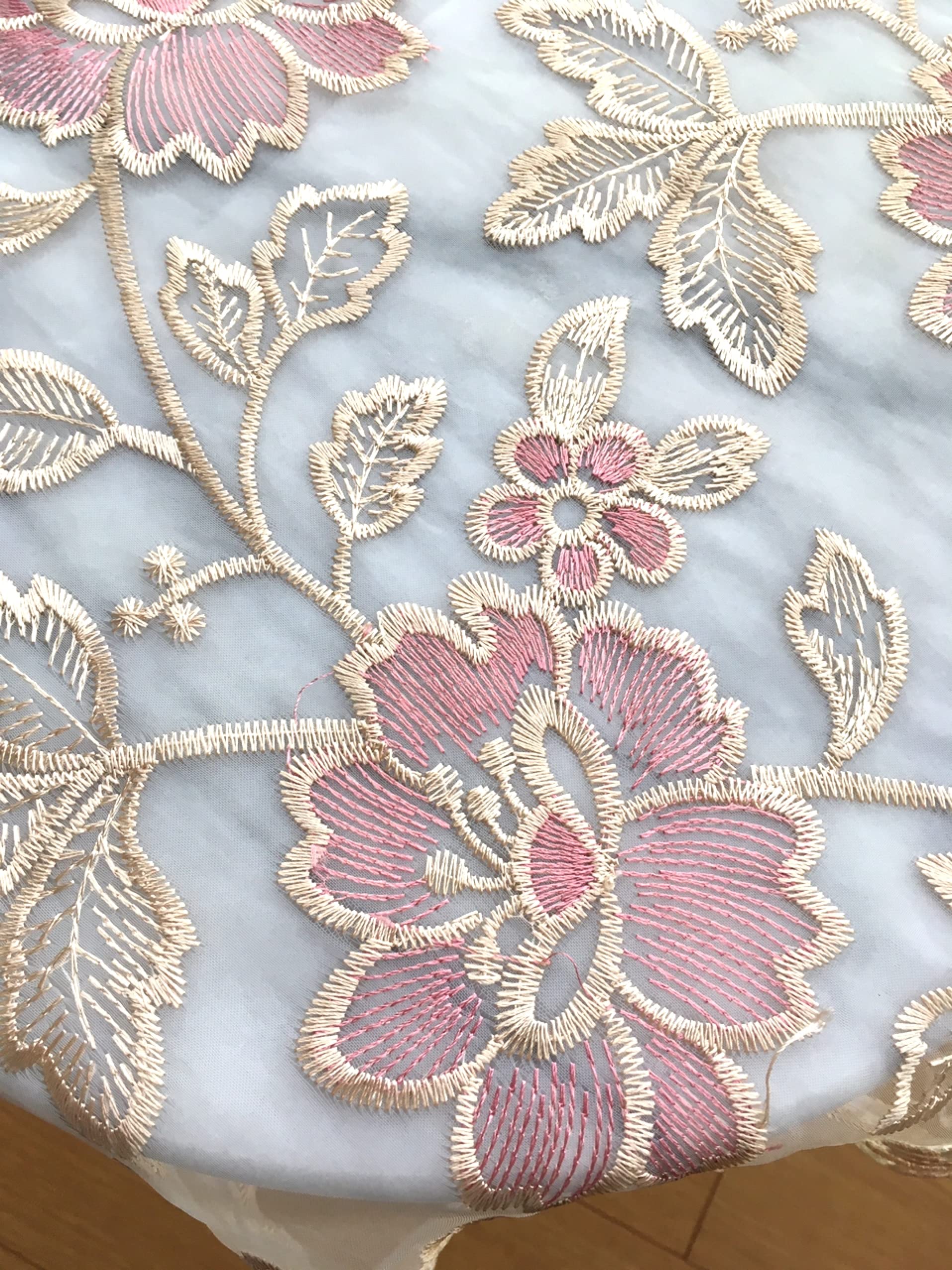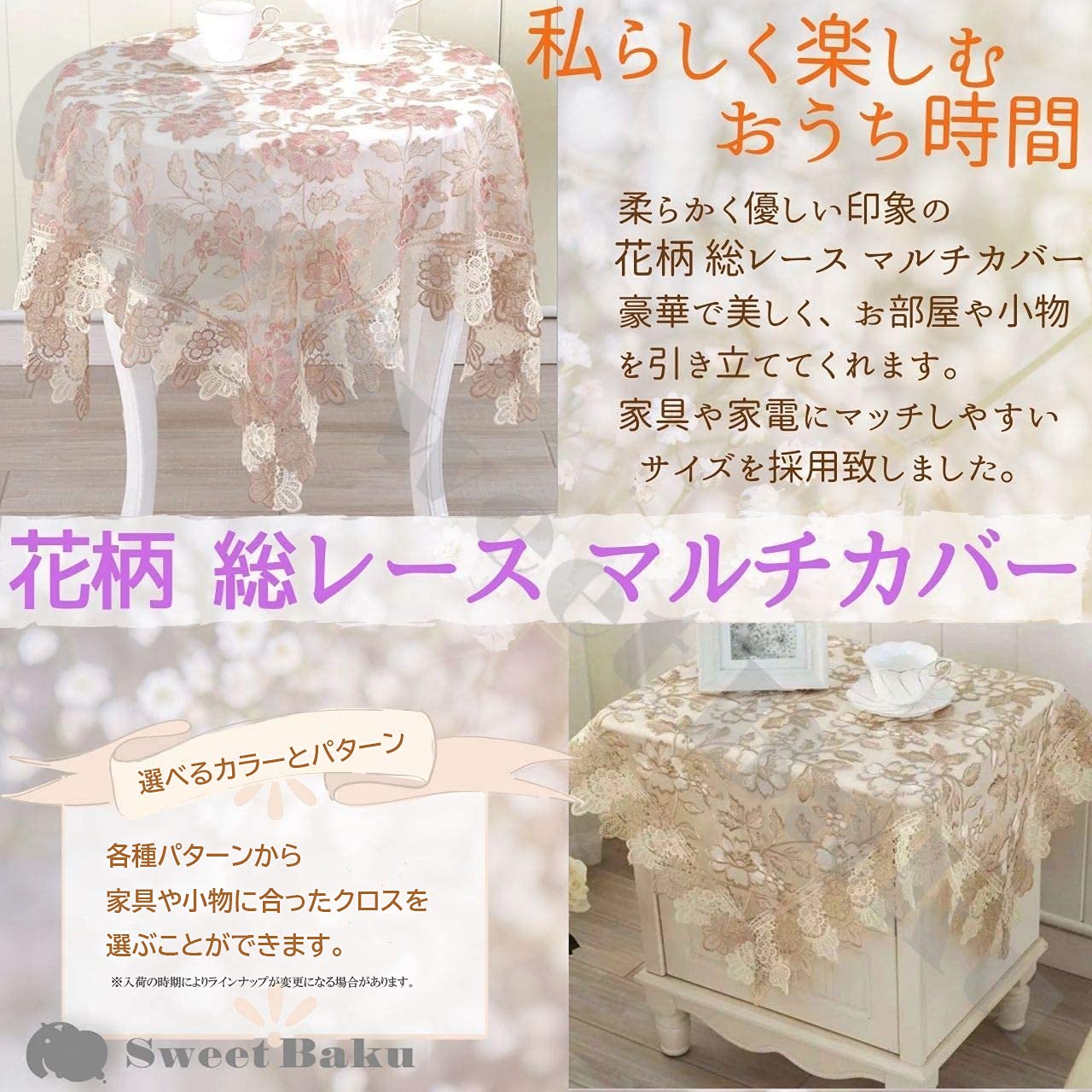 北欧風の光沢があり美しく上品なレースのテーブルクロスです。 淡いピンクと光沢のあるベージュでお部屋に1枚あるだけで華やぎ気分が上がります。おうち時間をリッチに気持ちよく過ごしたい方にいかがでしょう。 テーブルクロスやサイドテーブルに、正方形ですので丸テーブルにも合います。小物や家具 家電テレビ等のマルチカバーや敷物としても綺麗でお楽しみいただけます。 素材はポリエステルです。撥水にはなっておりません。日常的に食卓でご使用の時はビニールシートを被せると良いでしょう。 お手入れ方法 水洗いできます。洗濯機 乾燥機使用可能です。洗濯機では洗濯ネットをご使用ください。シワになり難いですが、洗濯後は早めに形を整えて陰干しが良いでしょう。 サイズ 60×60㎝ 110×110㎝ レースのカットにより2㎝程の誤差が生じることがございまます。