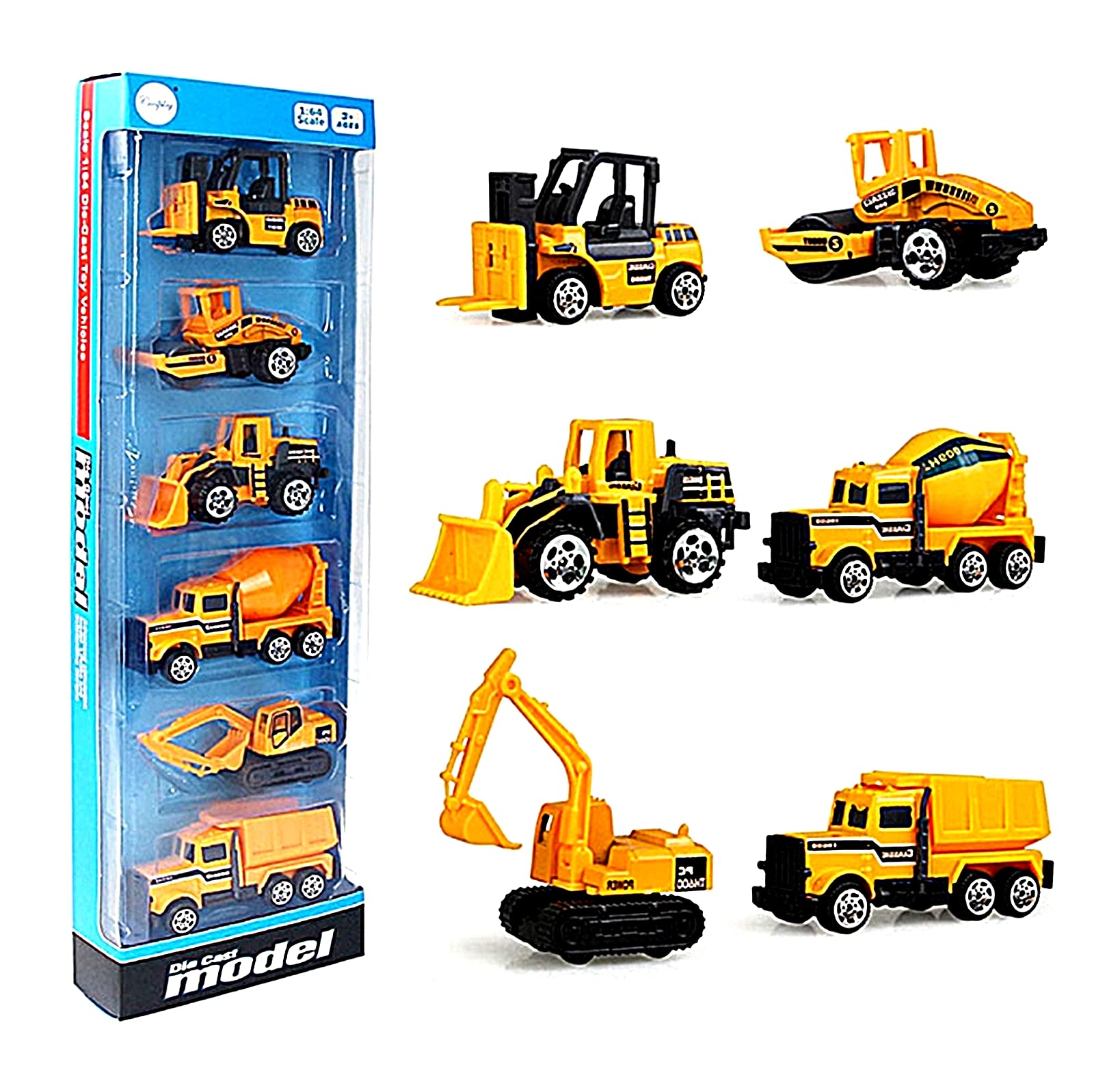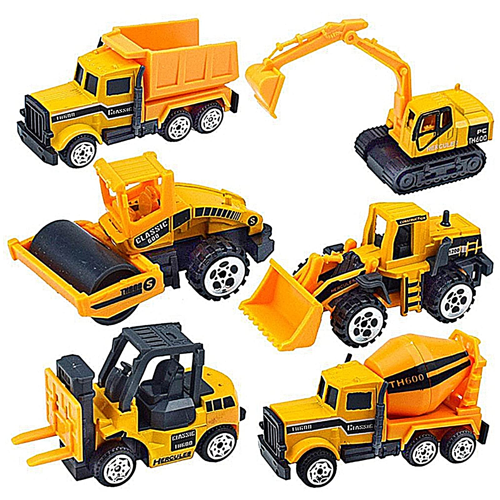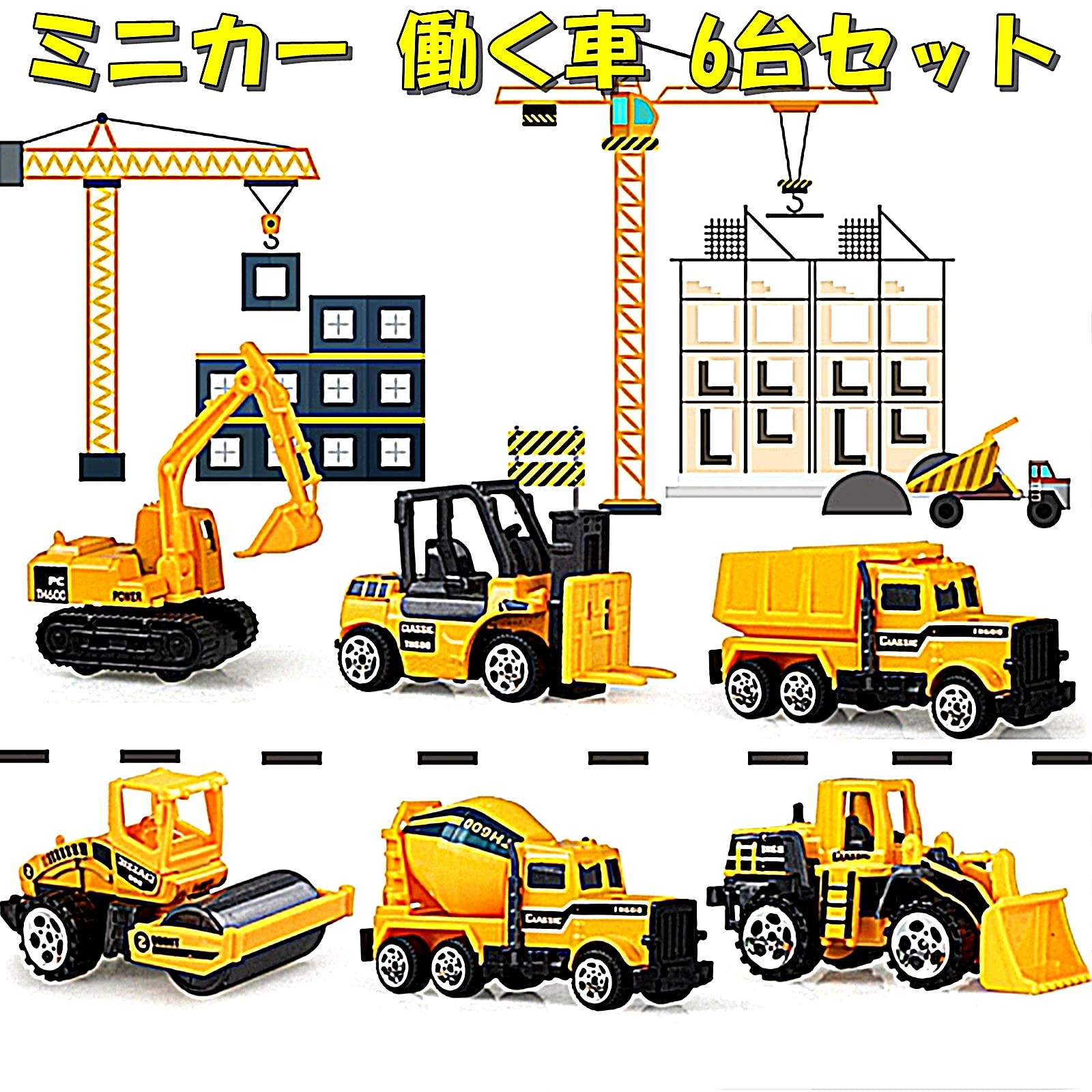 [TradeWind] ミニカー 働く車 建設車輛 工事現場 作業車 モデルカー 砂場遊び 模型 合金製 砂場 くるま おもちゃ ショベルカー クレーン車 6台セット(イエロー)