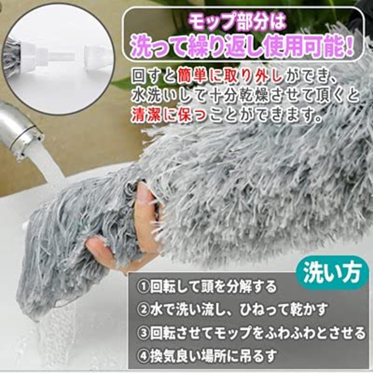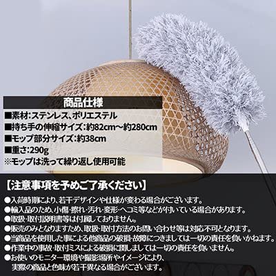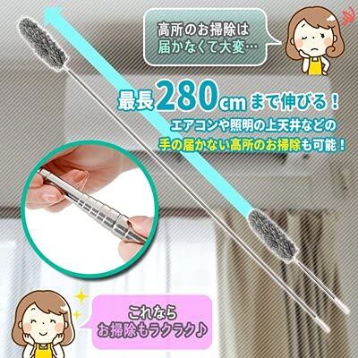 お掃除 グッズ スマート ロング モップ ロング ハンディ 軽量<br/>ダスター モップ ハンディ ロング ハタキ ホコリ払い 高所 掃除 伸縮式 280cm<br/><br/><br/>【商品説明】<br/><br/>〇最長280cmまで伸びる<br/>最長280cmまで伸びるのでエアコンや照明の上<br/>天井などの手の届かない高所のお掃除も可能。<br/><br/><br/>〇錆びに強く軽量なステンレス製<br/>軽いので腕や肩がしんどくなりにくく、お掃除がちょっと楽になるかも。<br/>丈夫なステンレス製なので長く使っていただけます。<br/><br/>〇曲がる<br/>モップ部分が曲がるので狭い隙間や家具の間など<br/>手の入らない所も自由自在です。<br/><br/><br/>〇モップ部分は洗って繰り返し使用可能<br/>モップ部分は回すと簡単に取り外しができ、水洗いして十分乾燥させて頂くと清潔に保つことができます。<br/><br/><br/><br/>【洗い方】<br/><br/>1、回転して頭を分解します<br/><br/>2、水で洗い流し、ひねって乾かします<br/><br/>3、回転させてモップをふわふわとさせます<br/><br/>4、換気良い場所に吊るす<br/><br/>商品仕様<br/><br/>素材:ステンレス、ポリエステル<br/>持ち手の伸縮サイズ:約82cm~約280cm<br/>モップ部分サイズ:約38cm<br/>重さ:290g<br/>※モップは洗って繰り返し使用可能<br/><br/>【注意事項を予めご了承ください】<br/>●入荷時期により、若干デザインや仕様が変わる場合がございます。<br/>●輸入品のため、小傷・擦れ・汚れ・変形・ヘコミ等などが付いている場合があります。<br/>●取扱・取付説明書等は付属しておりません。<br/>●販売のみとなりますため、取扱・取付方法のお問い合わせ等は対応不可となります。<br/>●当商品を使用した事による他商品の破損・故障につきましては一切の責任を負いかねます。<br/>●作業中の事故・取付ミスによる破損に関しましては一切の責任を負いません。<br/>●お使いのモニター環境や撮影場所やイメージにより、実際の商品と色味が若干異なる場合がございます。<br>■■送料に関して■■<br> 基本的には送料無料ですが、一部地域のお客様は別途追加料金が必要となります。<br><br> 【通常商品】<br> ※東北(青森・秋田・岩手・山形・宮城・福島)の方は送料一律+500円の追加料金が必要となります。<br> ※北海道の方は送料一律+1000円の追加料金が必要となります。<br> ※沖縄の方は5000円~別途送料の見積もりが必要となります。<br><br> 【大型商品】<br> ※東北(青森・秋田・岩手・山形・宮城・福島)の方は送料一律+1500円の追加料金が必要となります。<br> ※北海道の方は送料一律+2000円の追加料金が必要となります。<br> ※沖縄の方は5000円~別途送料の見積もりが必要となります。<br><br> ▲▲メール便(ゆうパケット等)での発送商品には追加送料は発生しません。<br>