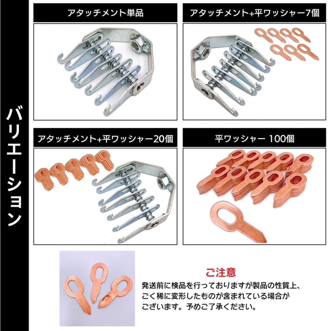 スライドハンマーに取り付けて使用する7本爪のアタッチメント単品だけでなく、平ワッシャー100個、両方のセットなど、 バリエーションを複数ご用意しているのでお好きなものをお選びください。