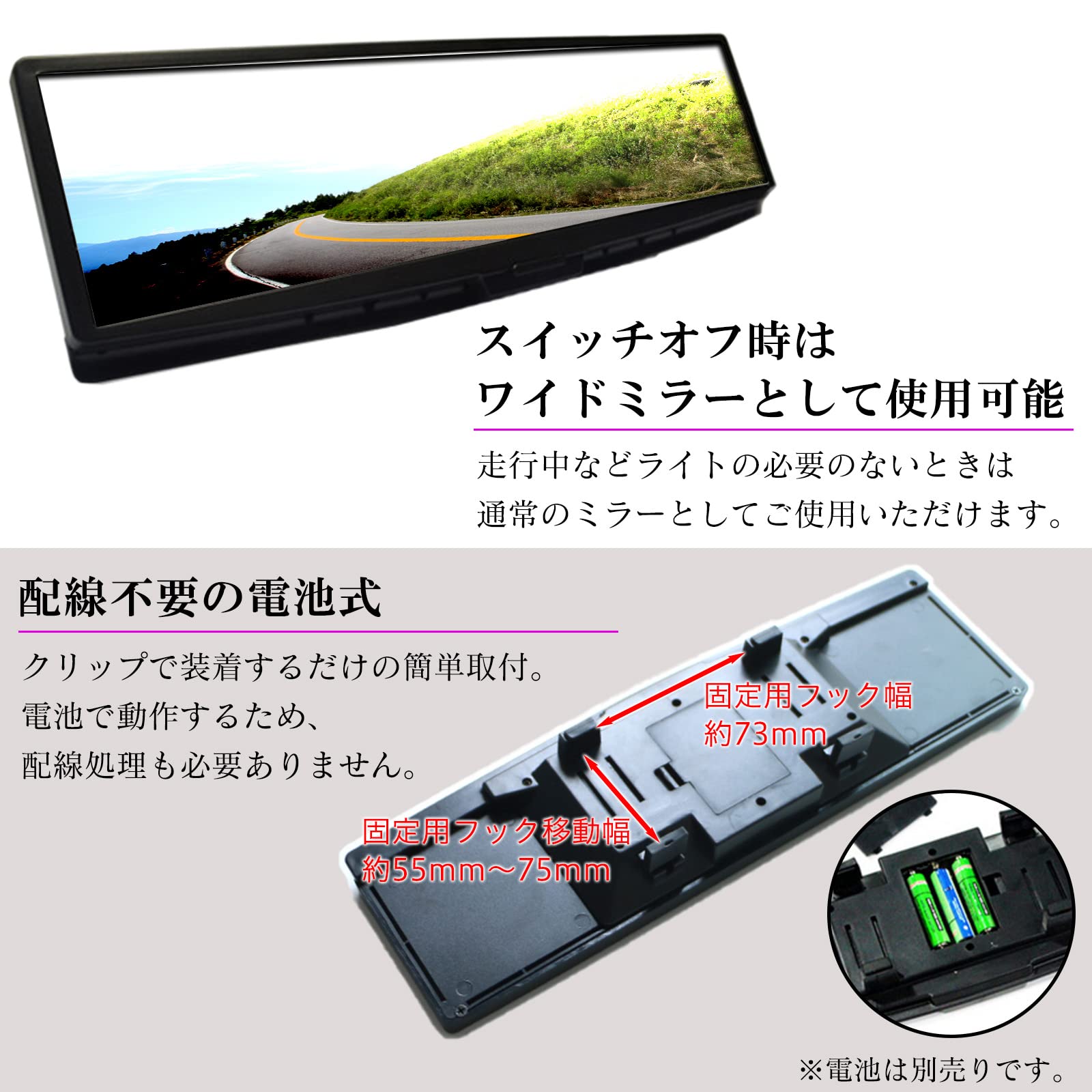 電池式でスイッチONでライトが点灯し、OFF時は通常の平面ワイドミラー(バックミラー)としてご使用いただけます。 ワイドなので視野も広く視認性も抜群でで、配線も無いので実用的です。 デザインも現代的なのでインテリアのカスタムパーツとしても活躍します。 ※単四電池3本(電池別売)