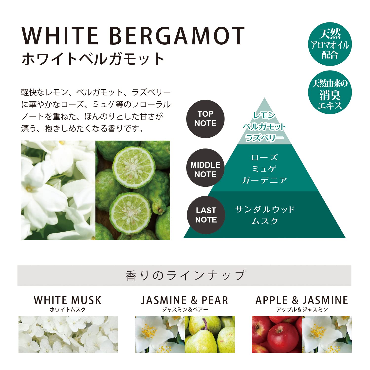 【ホワイトベルガモットの香り】軽快なレモン、ベルガモット、ラズベリーに華やかなローズ、ミュゲ等のフローラルノートを重ねた、ほんのりとした甘さが漂う、抱きしめたくなる香りです。