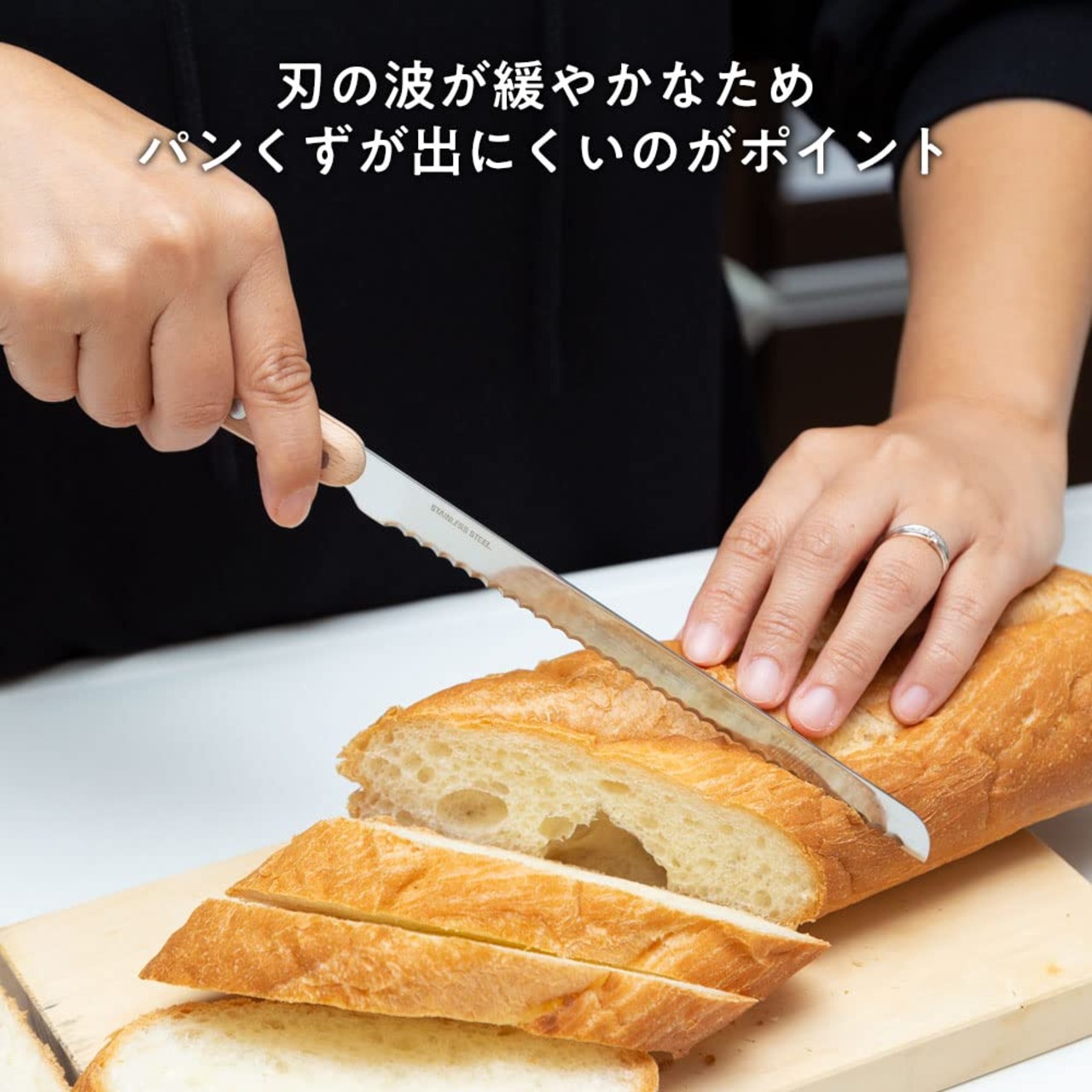 先が尖っていて、硬いパンも柔らかいパンも切りやすいため、初めて持つパン切り包丁にオススメです。 波刃タイプだから、トマトやのり巻き、具だくさんのサンドイッチもきれいにカットできます。 また刃の波が緩やかなため、パンくずが出にくいのもポイントです。 サイズは全長28.3cmとコンパクトなので、引き出しにもしまえて収納に便利。 付属の紙箱に入れておけば、しまう時、取り出す時に手を怪我することもなく、安全に扱えます。 持ち運びしやすいので、アウトドアのシーンでも活躍してくれますよ。